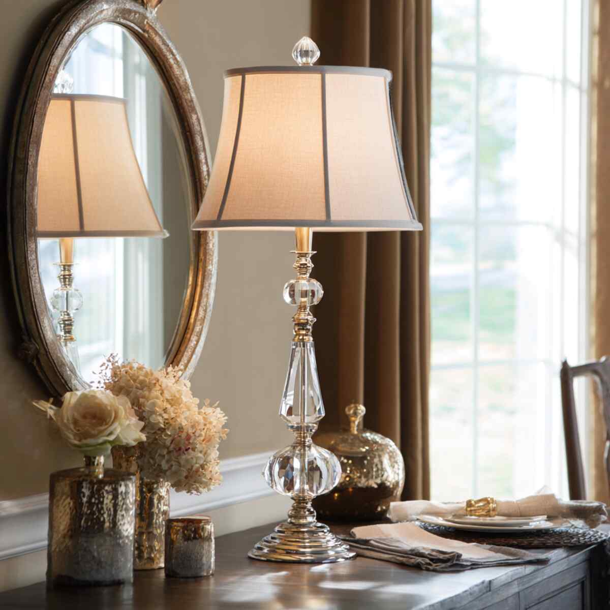 A crystal base lamp adds sparkle and sophistication to the dining area. Its reflective surface enhances natural light, making the corner shine elegantly.