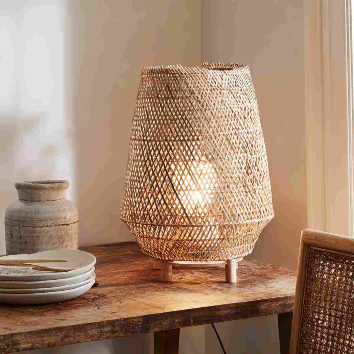 A bamboo woven lamp offers a soft, nature-inspired lighting effect perfect for relaxed dining. Its organic design creates patterns of light that add visual interest to your walls.