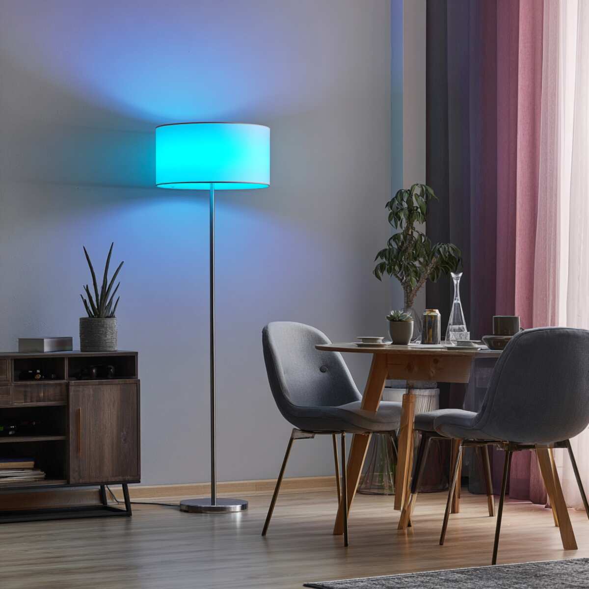 A smart RGB floor lamp allows you to change colors and brightness with a remote or app.