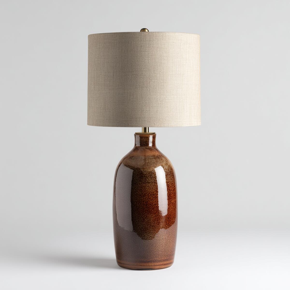 A tall ceramic base lamp with a linen shade adds height and texture to an empty dining corner.
