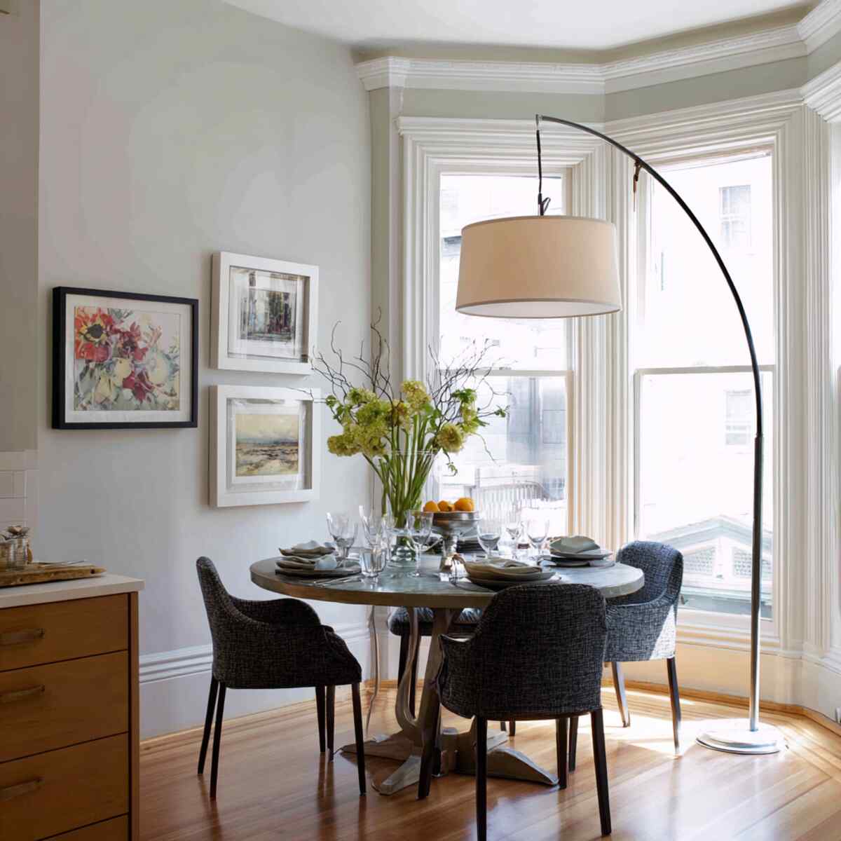 A dining room corner lamp can brighten dark spaces and add style without taking up much room.