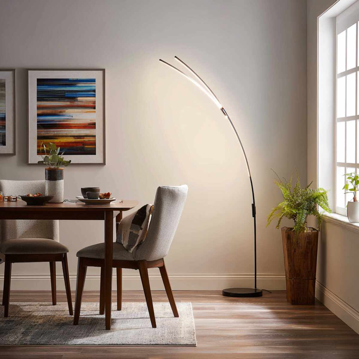 An arc floor lamp makes a bold statement by arching beautifully over your dining space. Its curved arm directs light right where it’s needed, adding elegance and function to an unused corner.