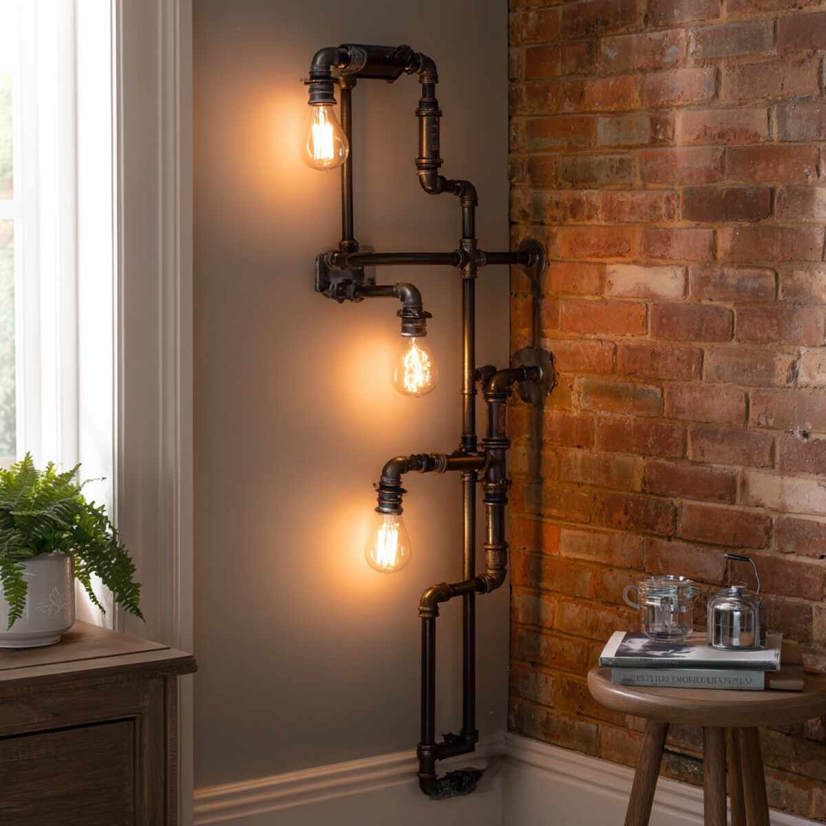 The industrial pipe-style lamp adds character with its exposed metal and vintage bulbs. It’s a great way to introduce a bit of edge and uniqueness to your dining corner.