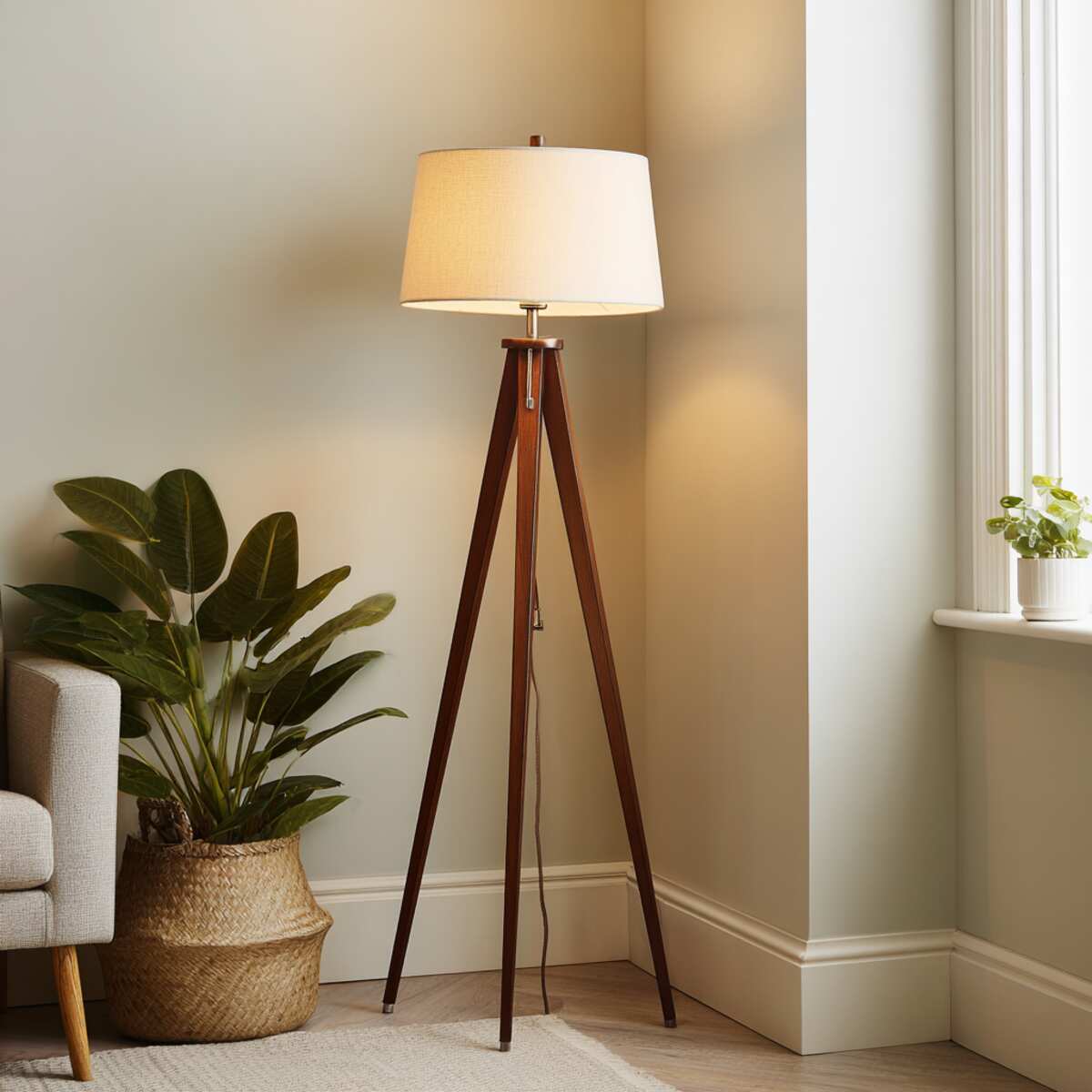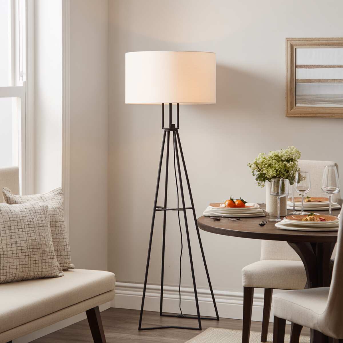 A tripod floor lamp with a fabric shade adds balance and warmth to your dining room corner. Its three-legged design gives a modern yet timeless appeal that fits well with many dining styles.