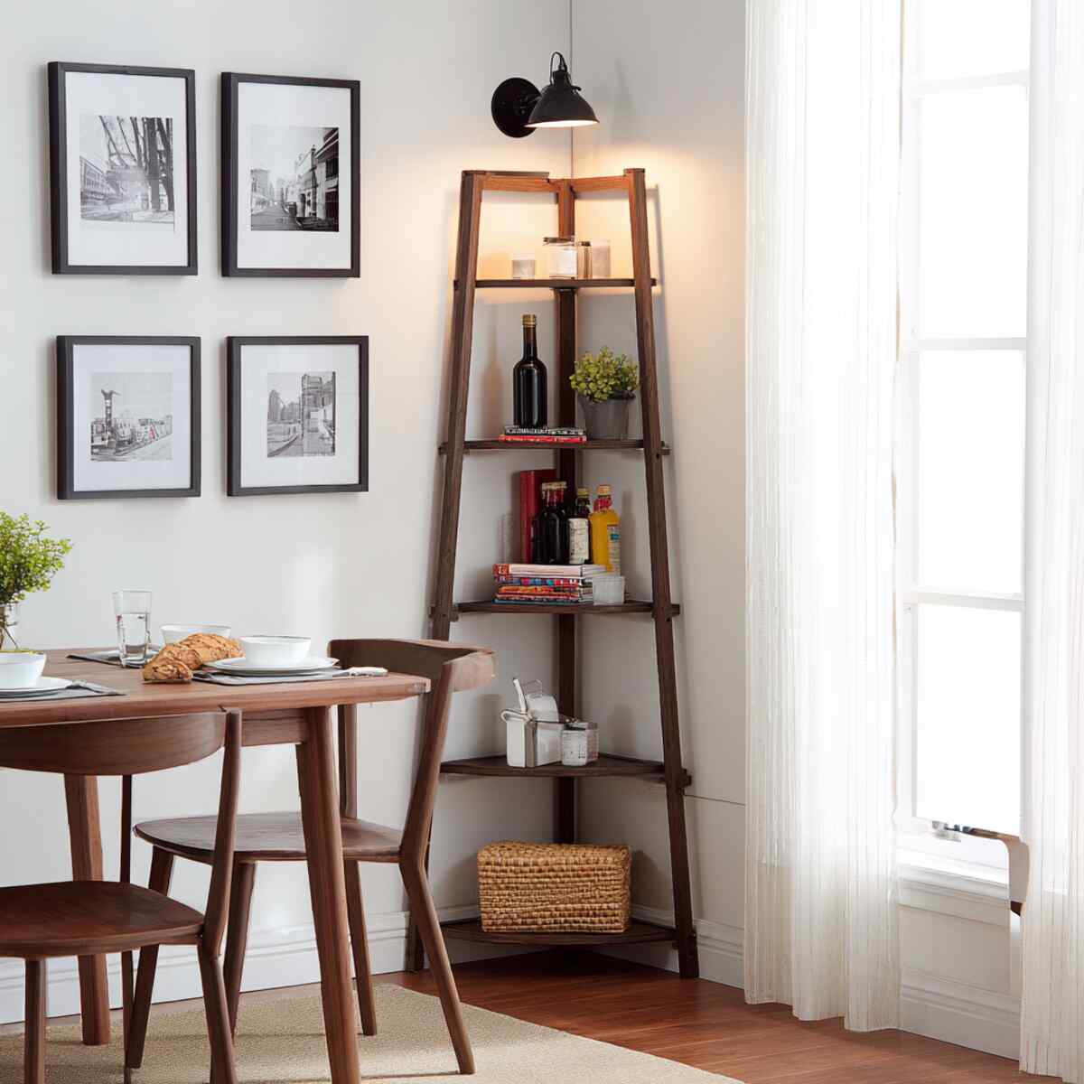 A corner shelf lamp combines lighting and storage in one smart piece. You can display plants, books, or decorative pieces while brightening your dining area.