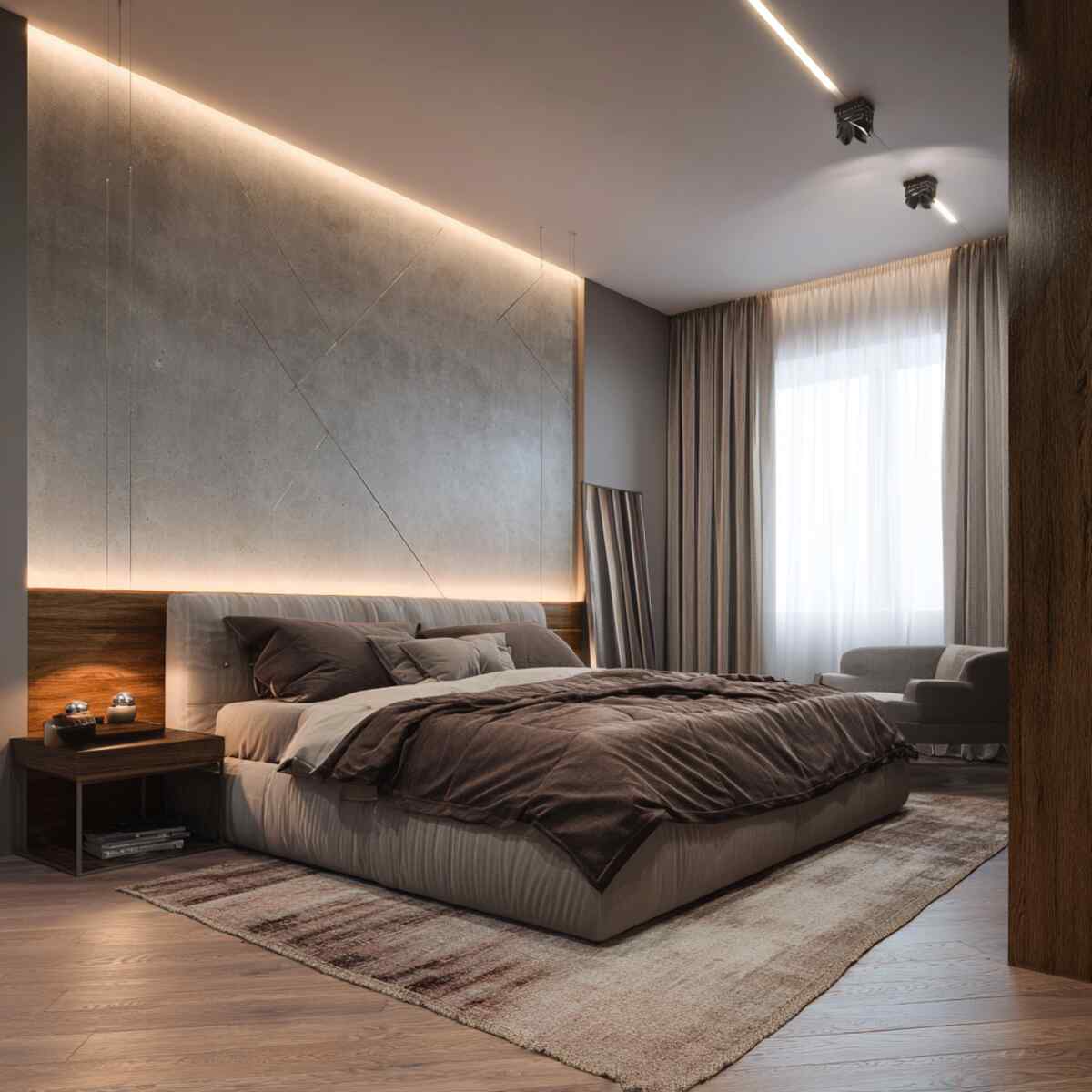 This Accent Wall Lighting Idea for Bedrooms emphasizes architectural details while maintaining a clean look. It’s a great option for adding gentle ambiance without visible light fixtures.