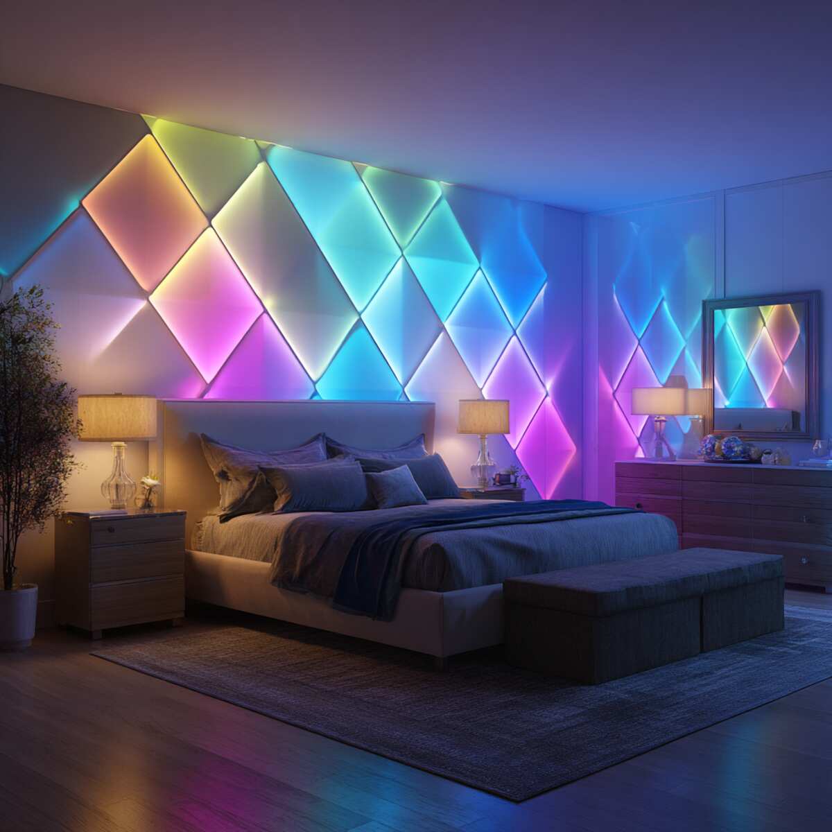 Smart LED panels are futuristic Accent Wall Lighting Ideas for Bedrooms that let you customize colors and brightness. With app or voice control, you can set moods for relaxation or focus.