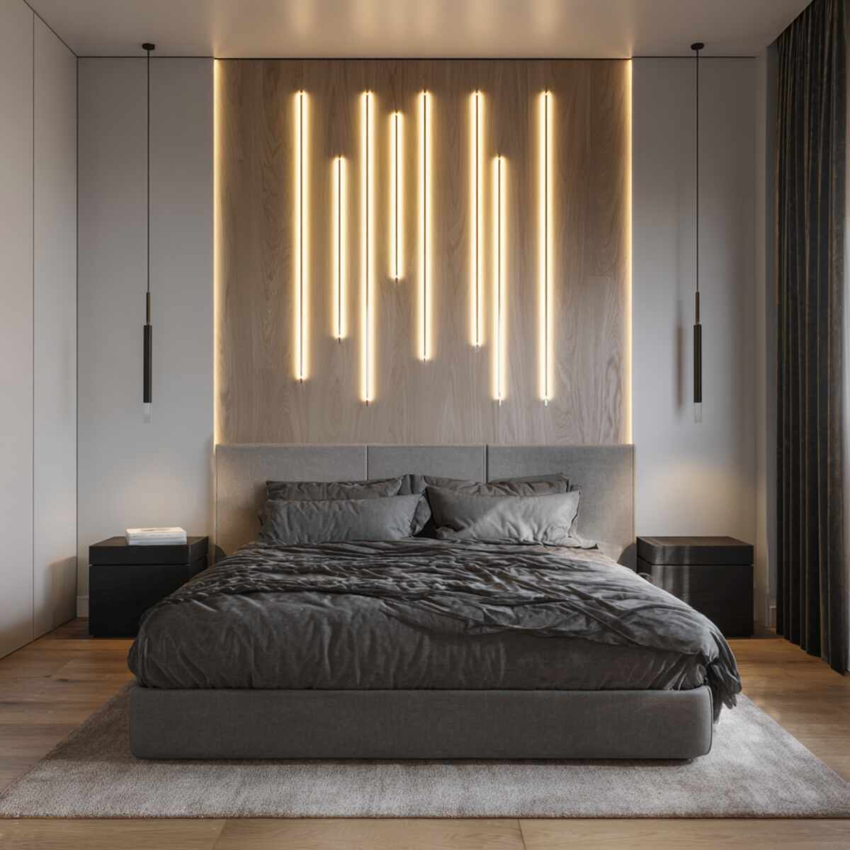 Vertical light bars instantly modernize your bedroom and draw the eye upward. As one of the trendiest Accent Wall Lighting Ideas for Bedrooms, they enhance the sense of height and style.