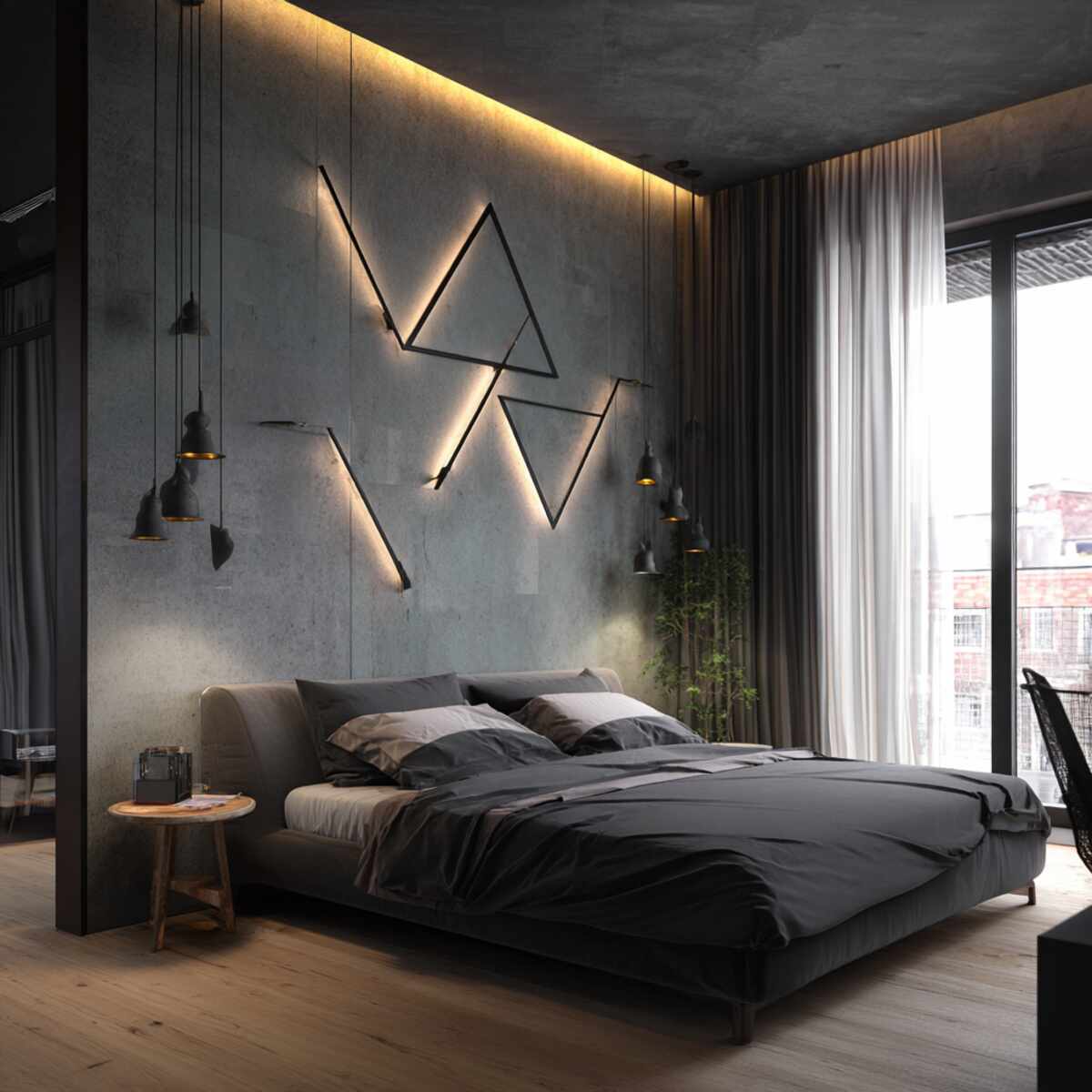 Geometric fixtures are bold and creative Accent Wall Lighting Ideas for Bedrooms that double as art pieces.