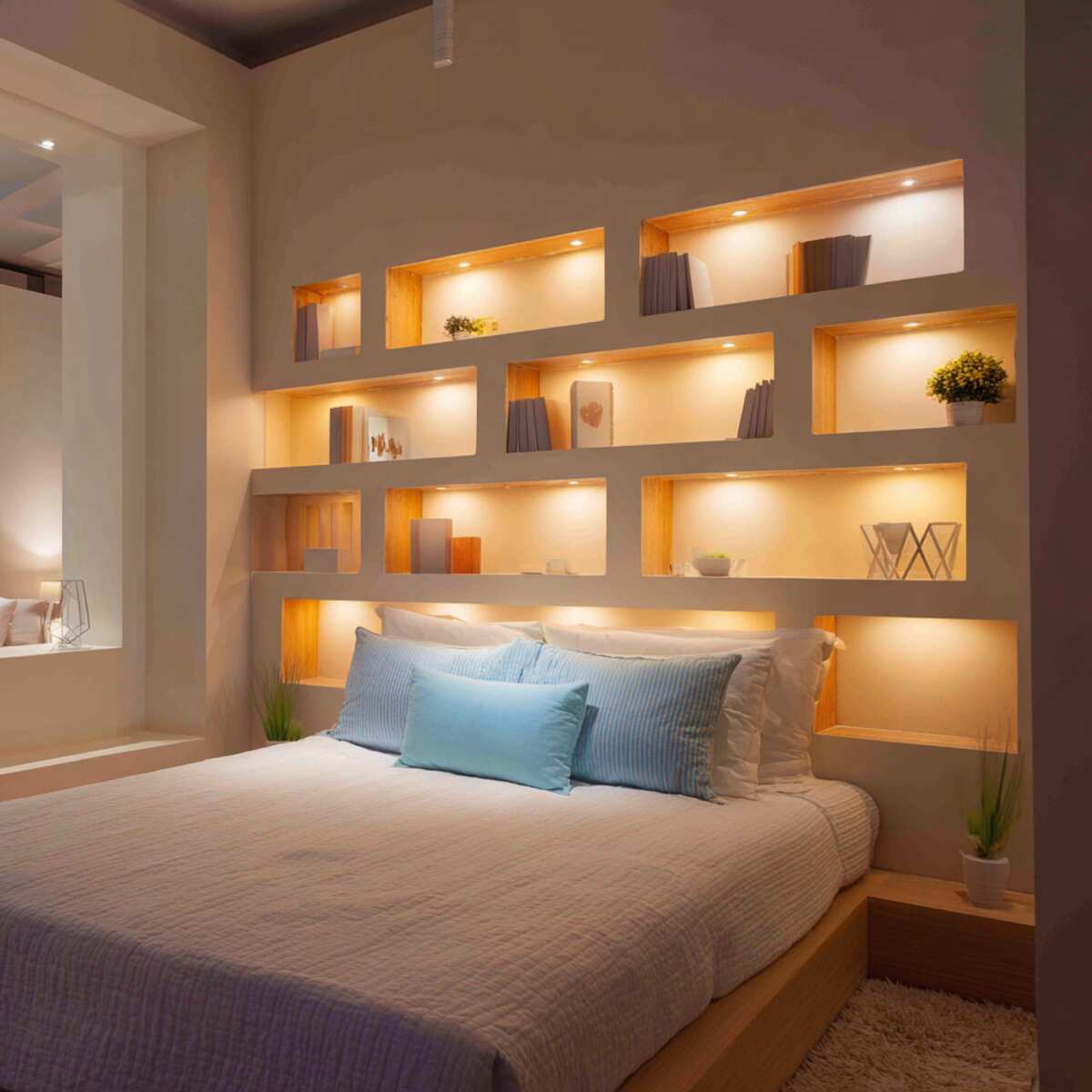 These lights add a soft ambiance that highlights your wall color or texture, making your bedroom feel cozy and stylish.