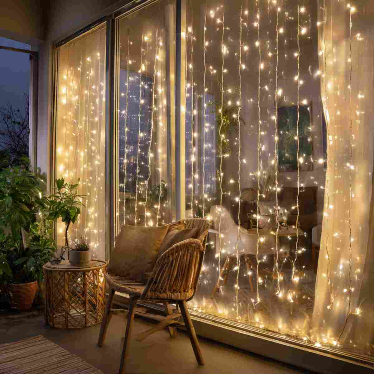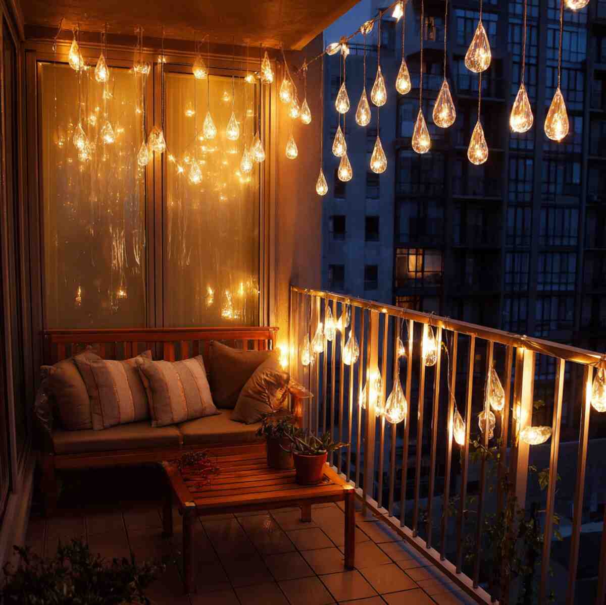 Curtain string lights can turn a plain balcony wall or railing into a glowing backdrop. Their cascading effect creates a dreamy atmosphere, perfect for evening relaxation or photo-worthy moments.