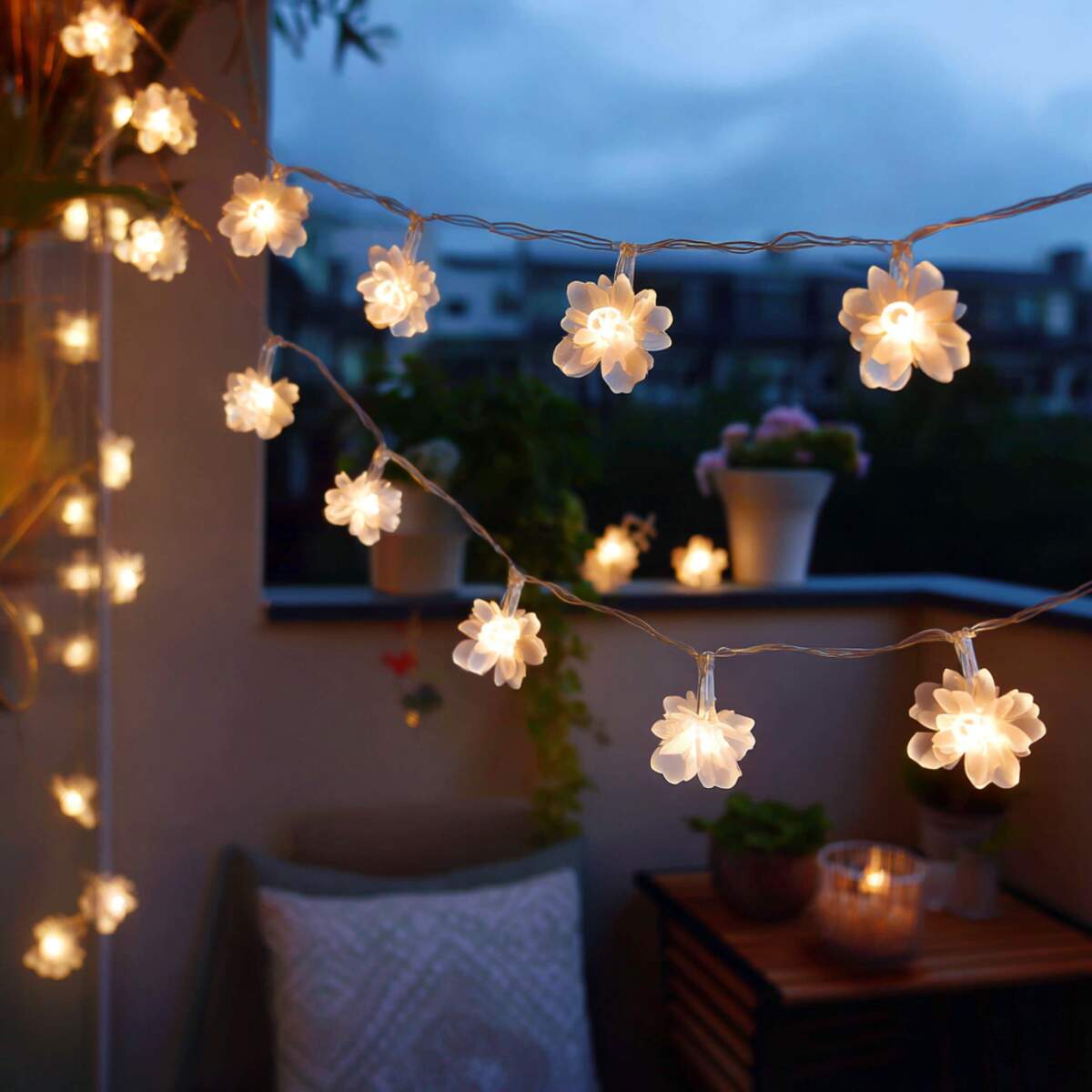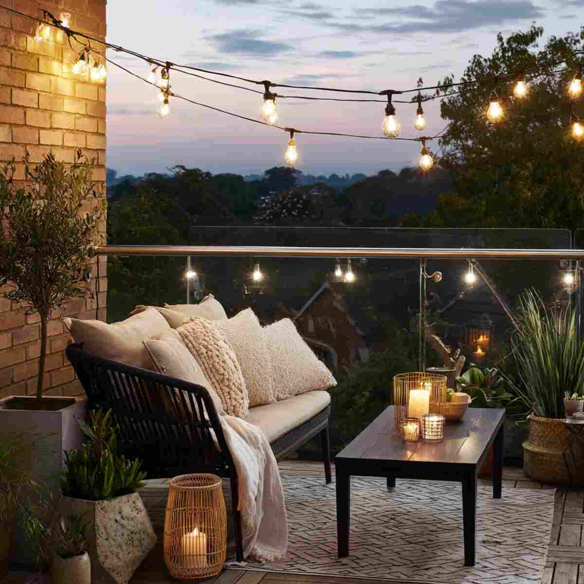 Warm white fairy light strings create a cozy and welcoming glow that transforms any balcony into a peaceful retreat.