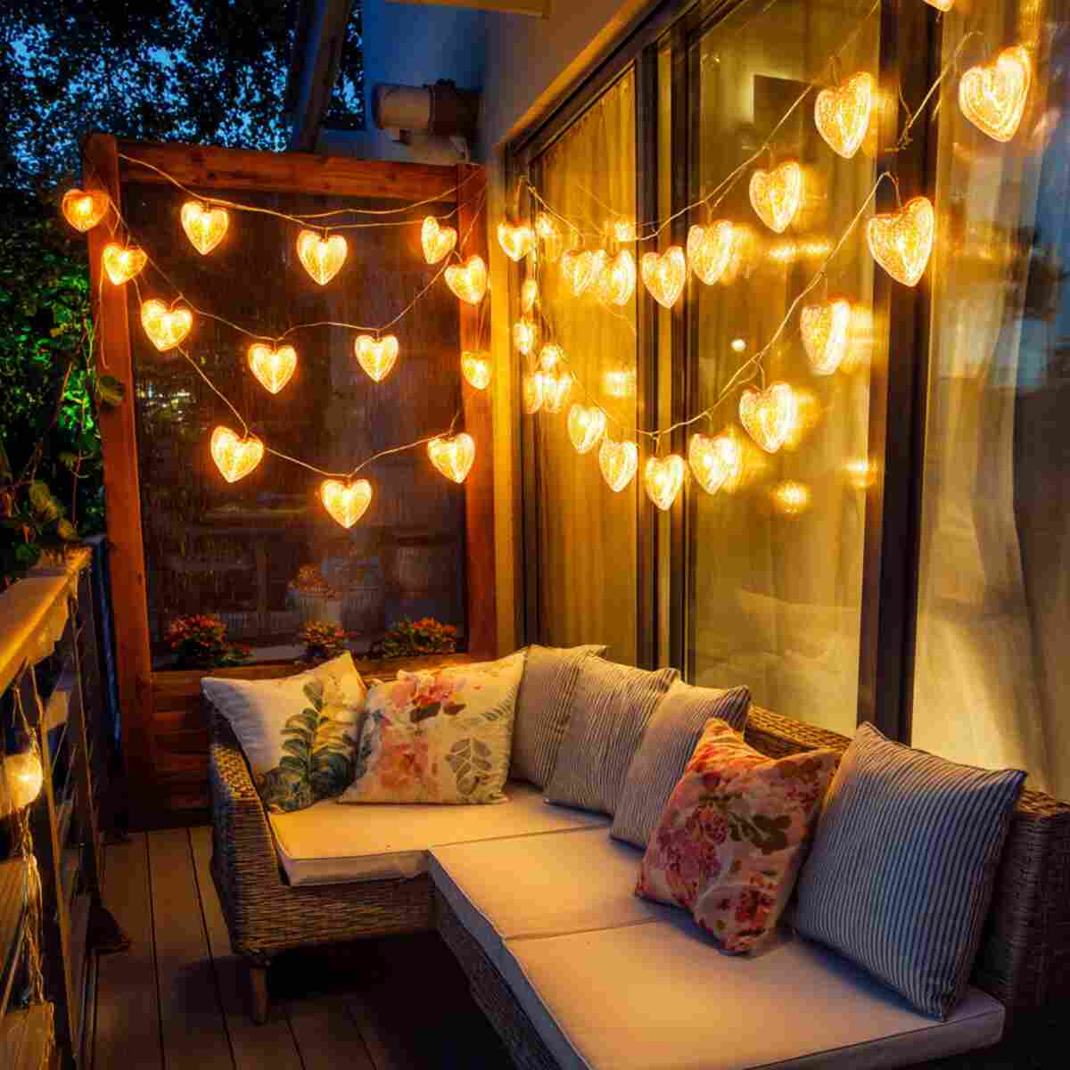 Heart-shaped string lights make your balcony feel cozy and full of love. They’re great for couples or anyone wanting a more personal decorative touch.
