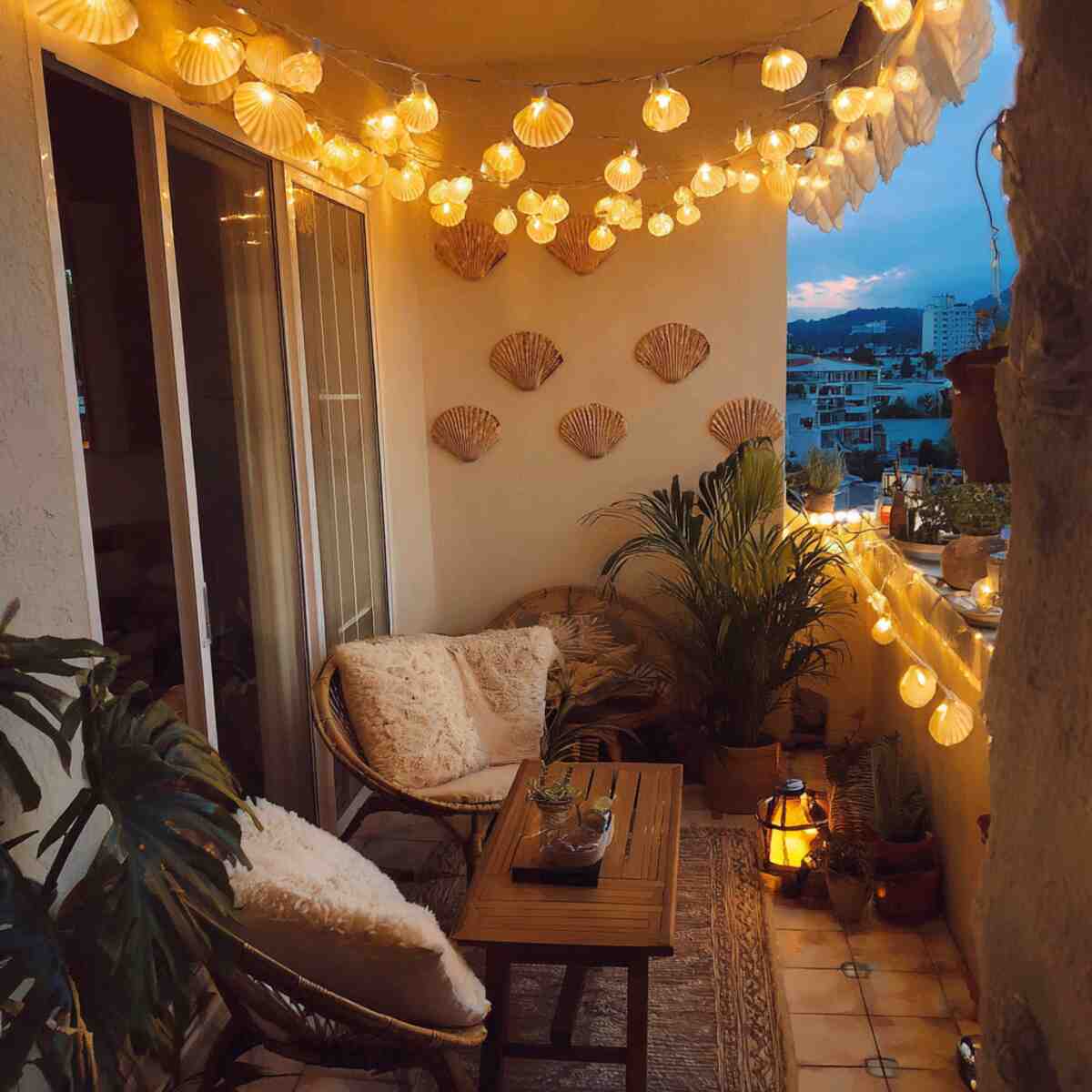 The delicate shells glow beautifully when lit, creating a calm and breezy vibe. This Balcony Lighting String Idea is ideal for beach lovers who enjoy relaxing outdoor evenings.