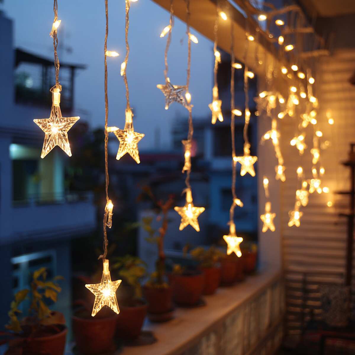 Twinkle star string lights sparkle gently, giving your balcony a night-sky effect. They can be hung across ceilings or intertwined with plants to mimic starlight.