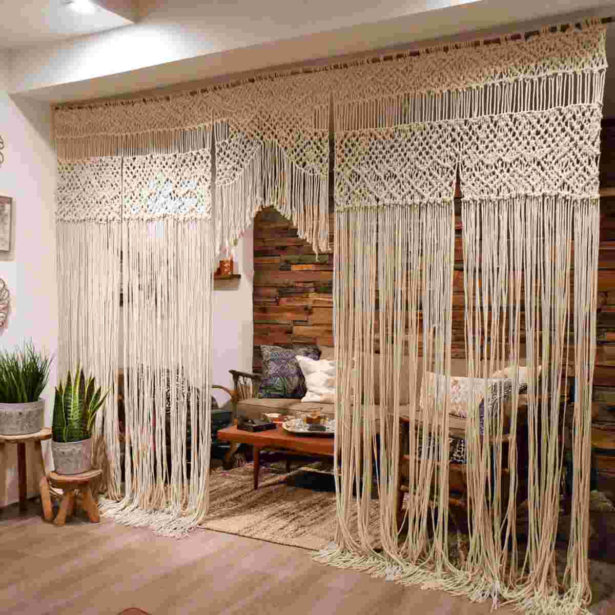 Macramé curtains bring a handmade and bohemian vibe to the basement.