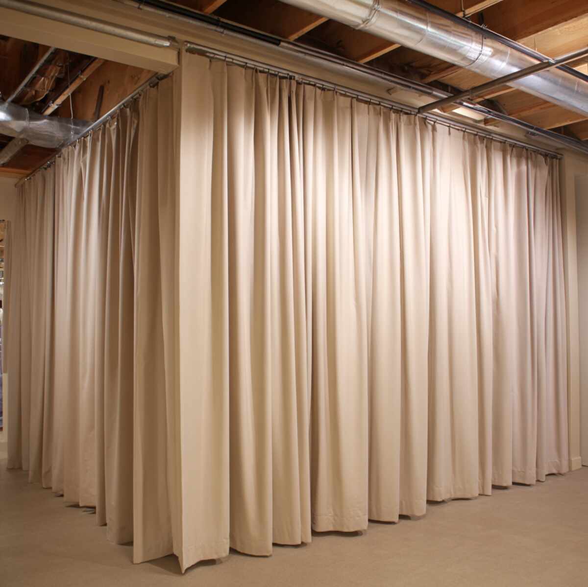 As one of the most practical Basement Divider Curtain Ideas, they also help with sound reduction.