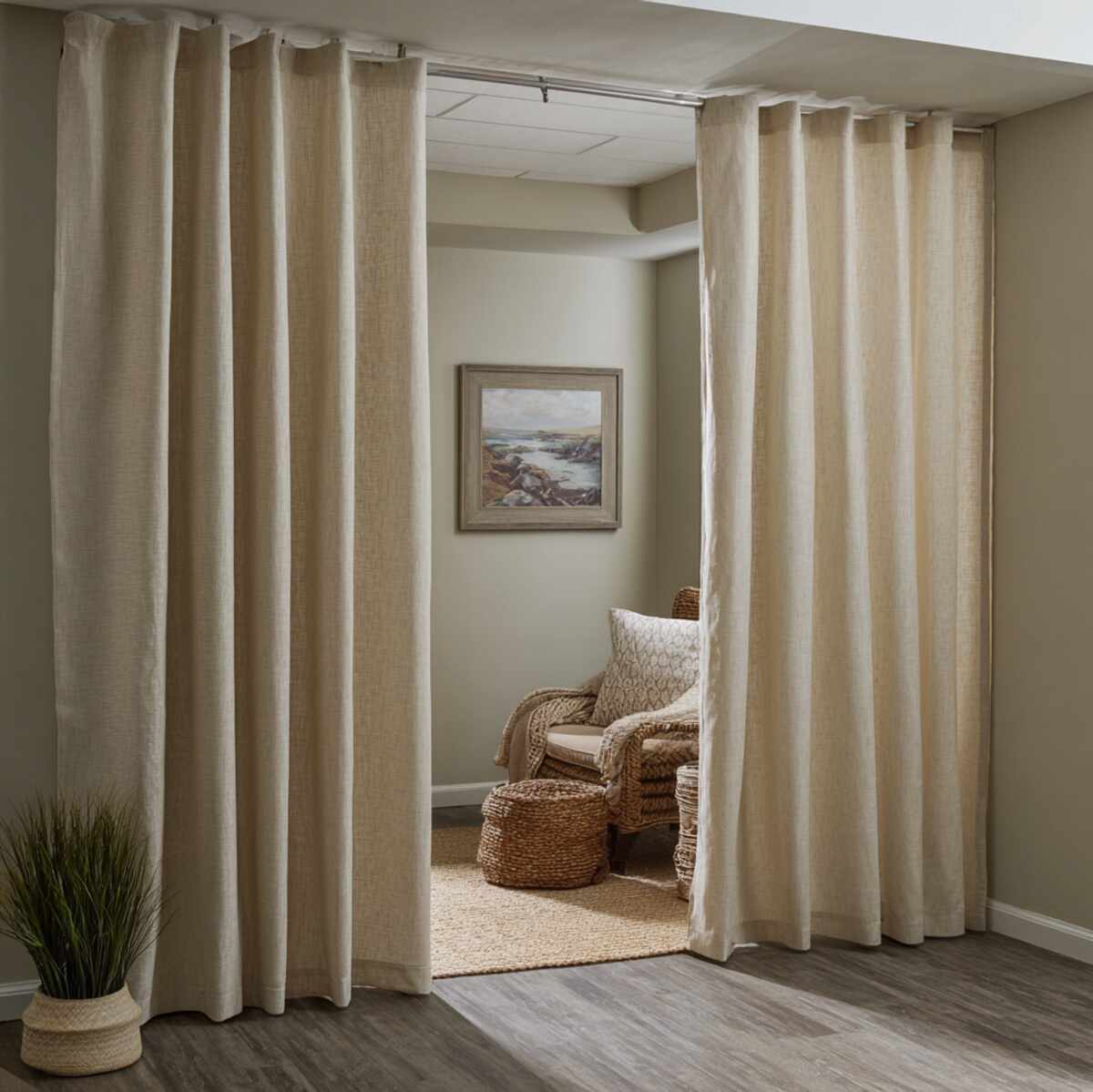 Linen-style curtains offer a clean and natural look that works well in both modern and rustic basements.