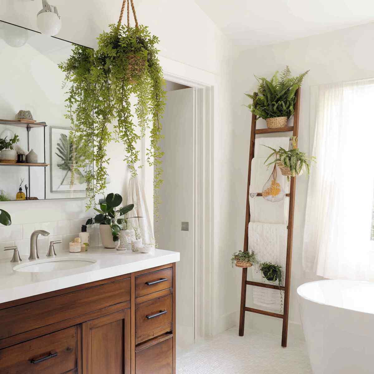 10. Ladder-Style Hanging Plant Display Near the Vanity