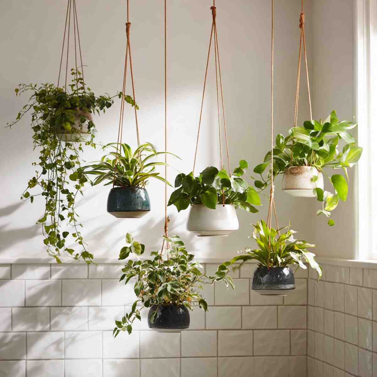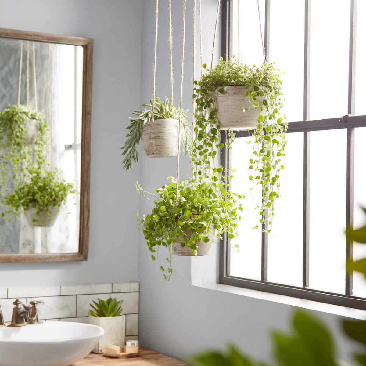 Placing hanging planters close to a bathroom window ensures your plants get the light they need to thrive.