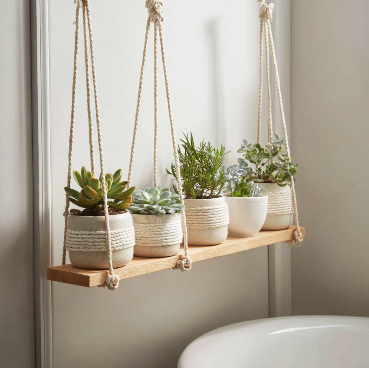 Rope shelf hangers offer a mix of hanging and shelving, giving your plants both height and stability.