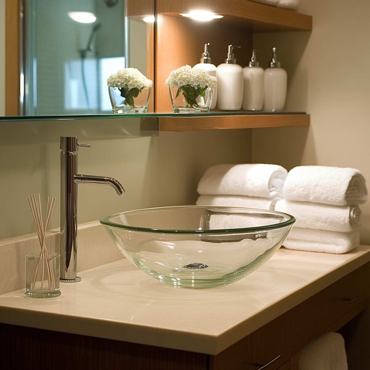 Glass shelving adds a clean, transparent look to Bathroom Vanity Open Shelf Ideas, making the bathroom appear larger.