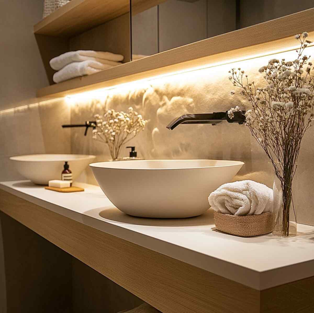 LED under-lighting makes Bathroom Vanity Open Shelf Ideas feel more luxurious and modern by highlighting the shelves.