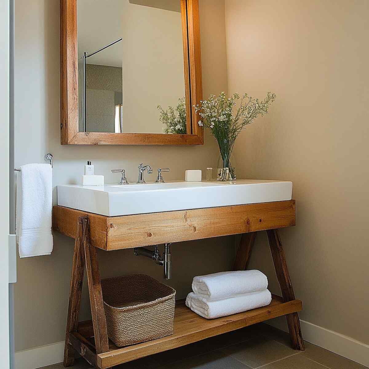 The natural grain and weathered texture make the vanity look warm and inviting. This idea is important because it mixes sustainability with beautiful, functional design.