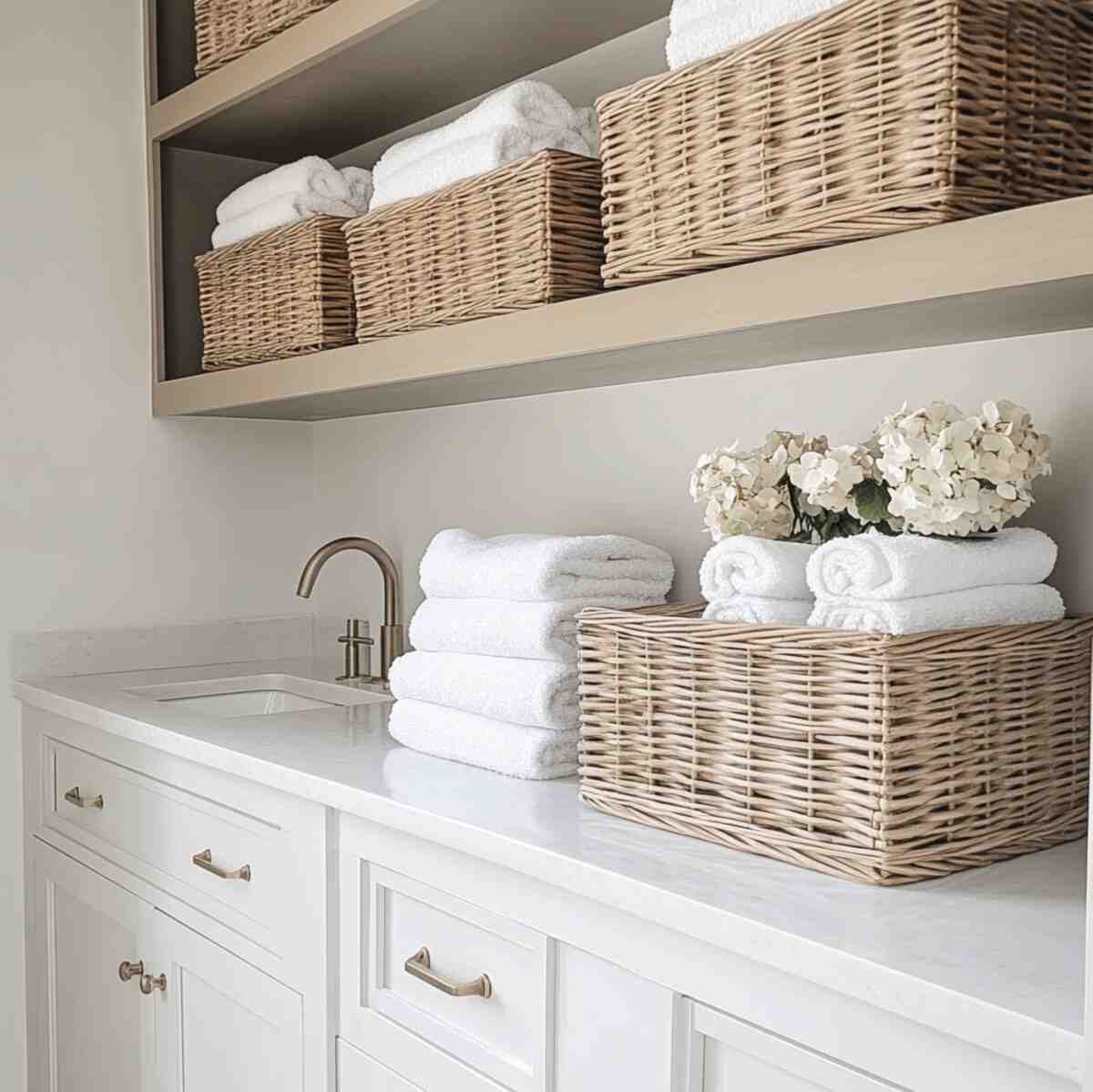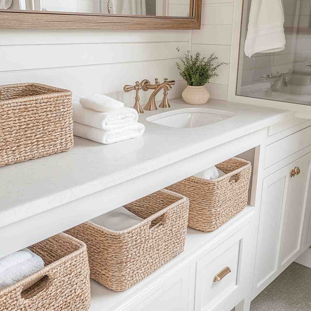 Cane-front baskets work beautifully with Bathroom Vanity Open Shelf Ideas because they blend natural texture with hidden storage.