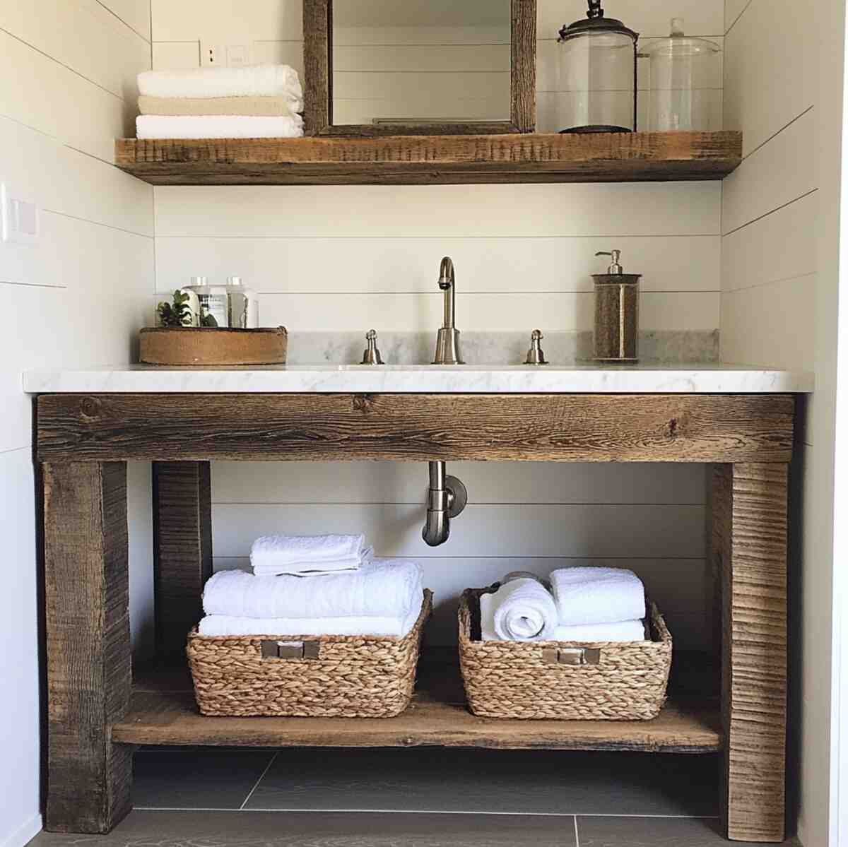 Rustic reclaimed wood is a charming choice among Bathroom Vanity Open Shelf Ideas, especially for farmhouse or vintage-themed bathrooms.