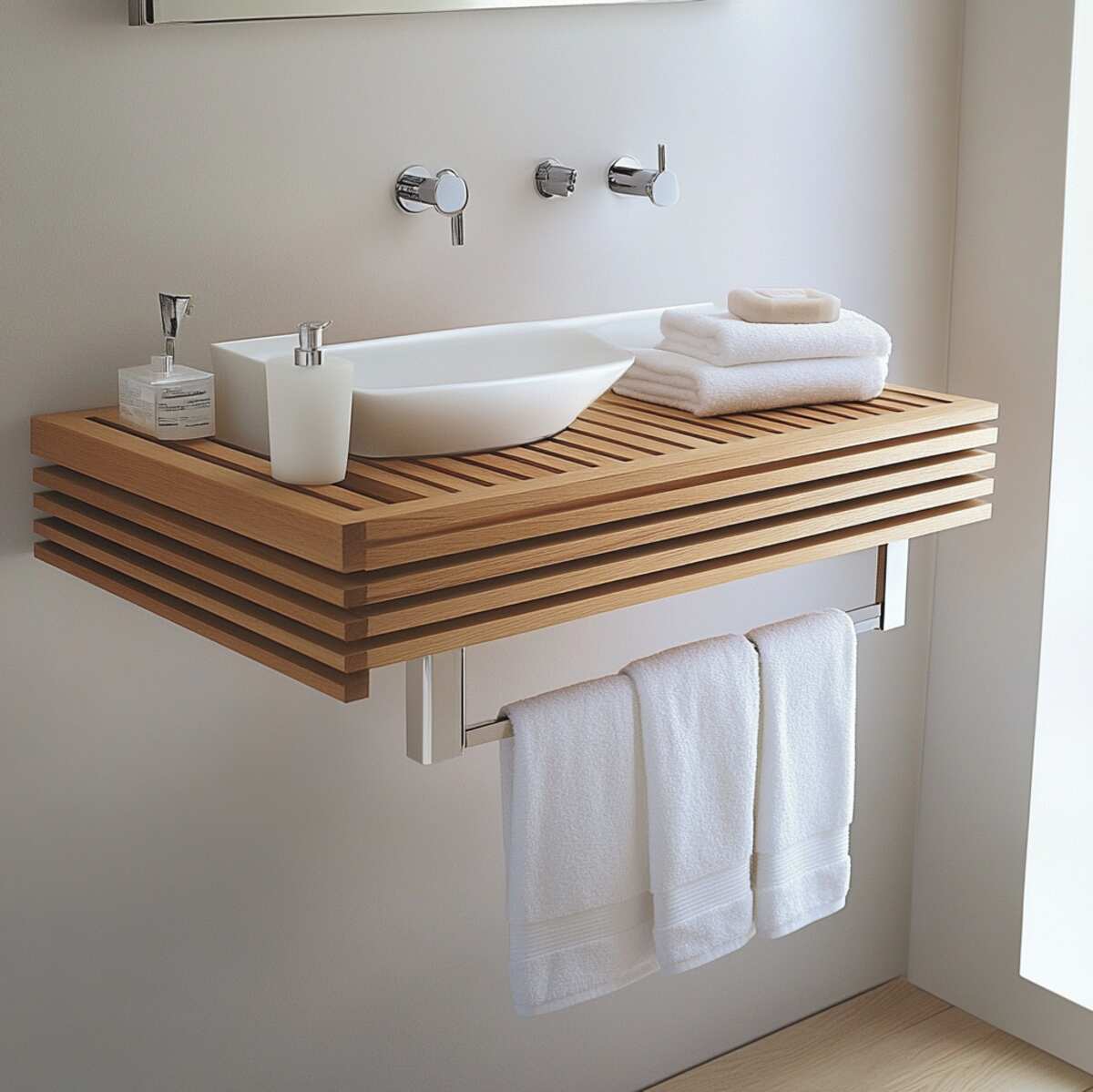 A slatted wood shelf brings a simple, clean look that fits perfectly into Bathroom Vanity Open Shelf Ideas for small or modern bathrooms.