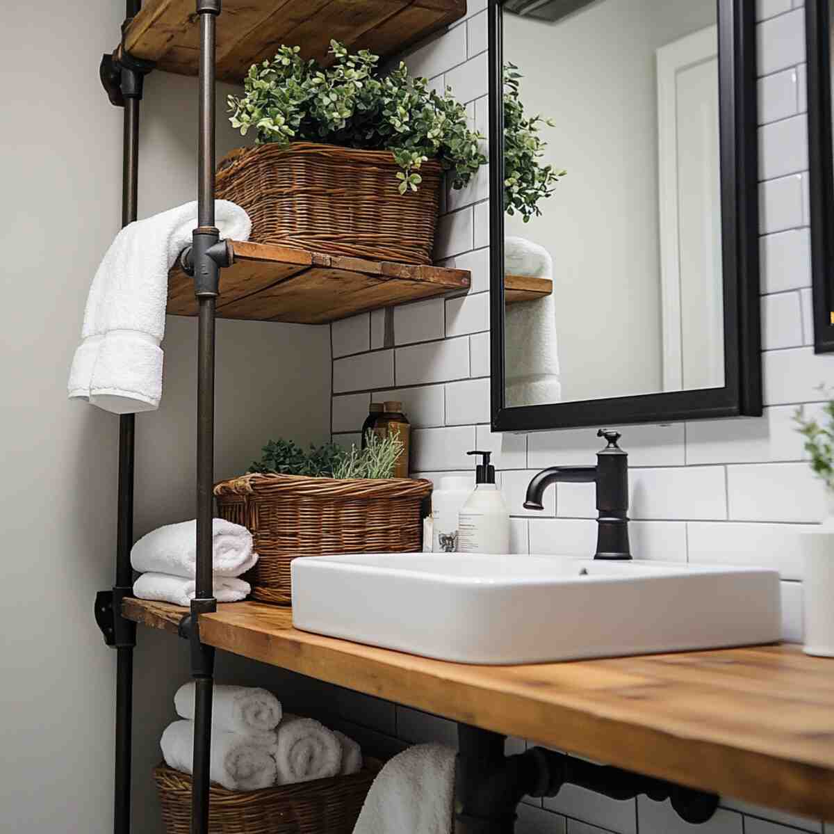 Industrial pipe-style shelving adds a bold look to Bathroom Vanity Open Shelf Ideas, mixing wood and metal in a strong design. The pipes provide solid structure, and the shelves offer plenty of space for essentials.