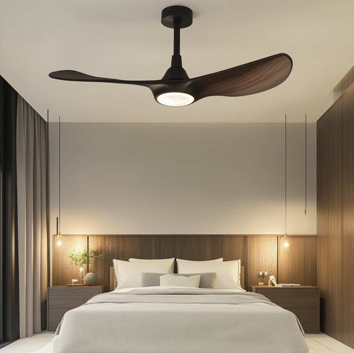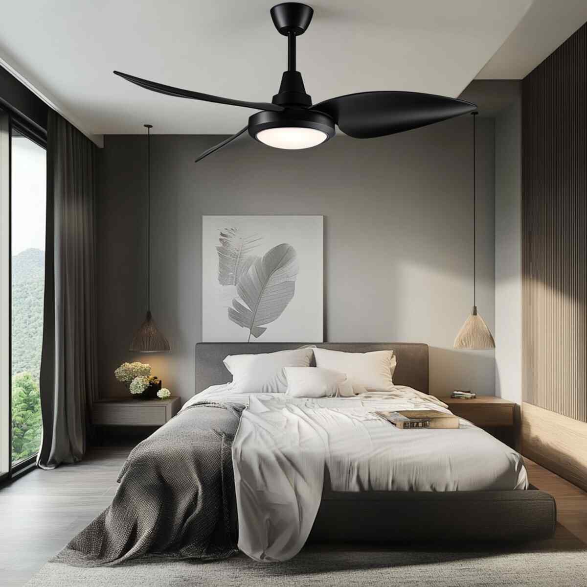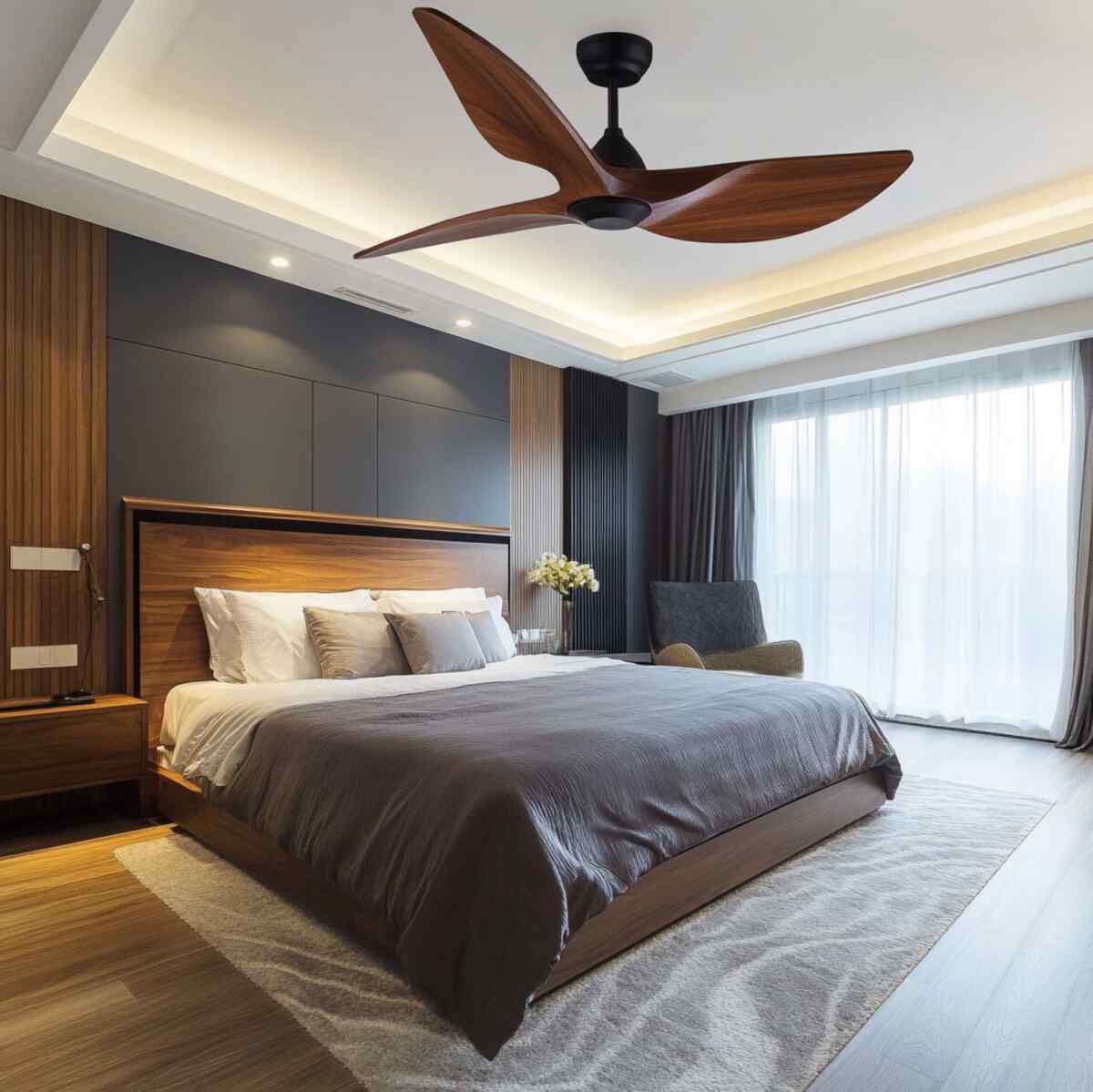 A three-blade aerodynamic fan delivers strong airflow with a modern, streamlined look. It fits well in Bedroom Ceiling Fan Design Ideas that focus on simplicity and efficiency.