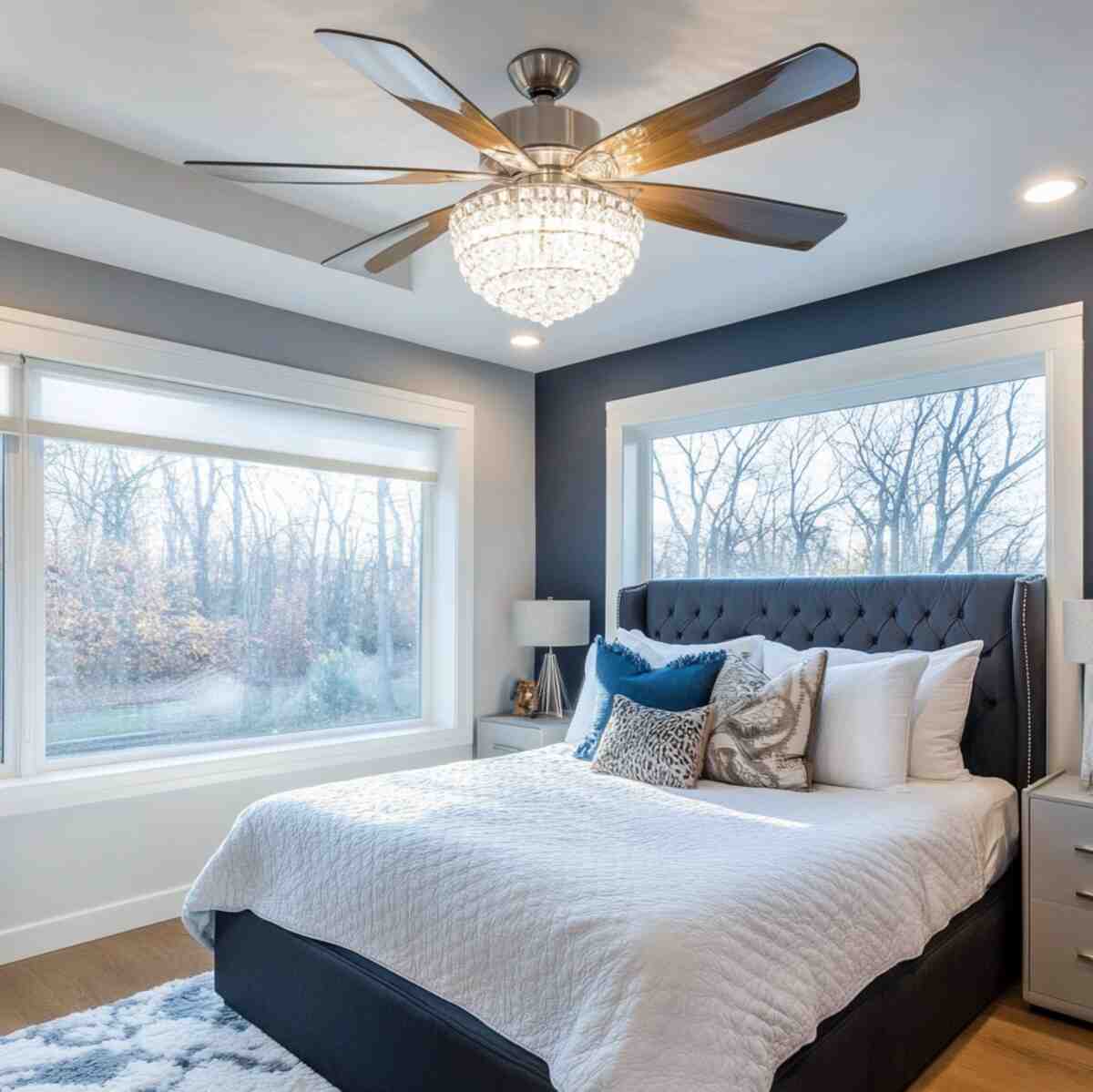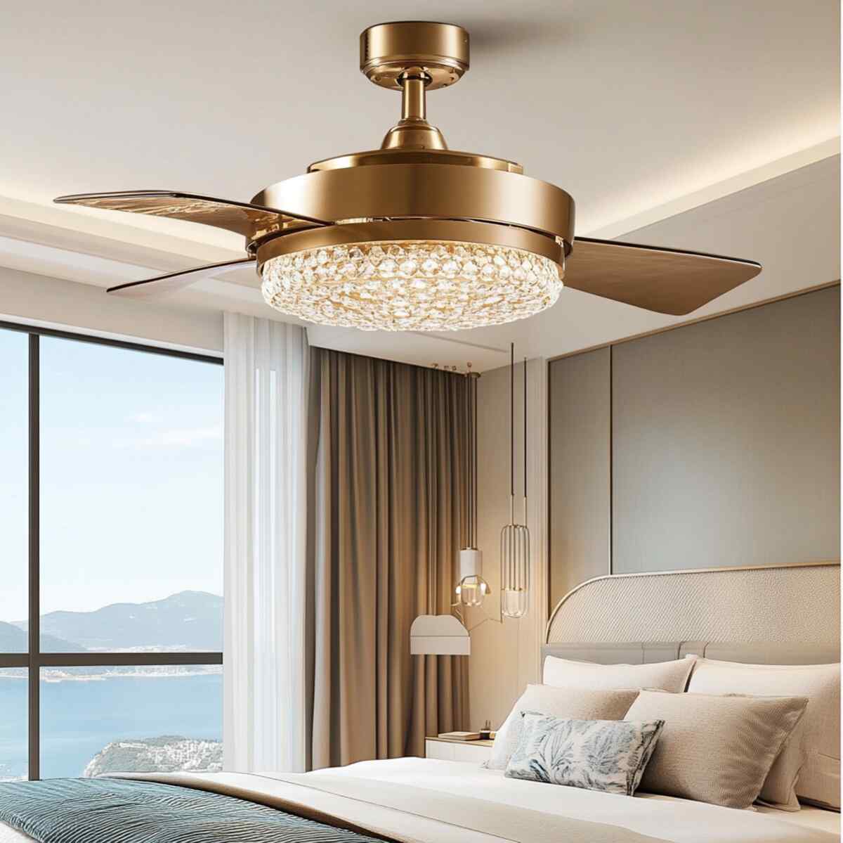A fan with crystal accents brings sparkle and elegance into the bedroom. Among glamorous Bedroom Ceiling Fan Design Ideas, this design adds both lighting beauty and cooling comfort.