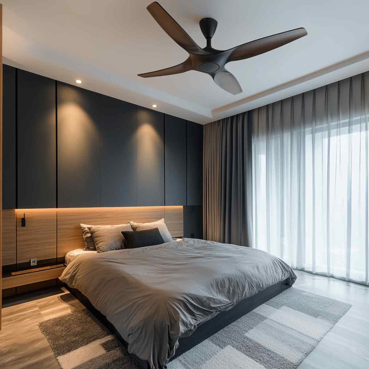 A dual-blade fan looks modern and artistic, making it a great statement piece. It stands out in Bedroom Ceiling Fan Design Ideas because of its unique shape and sculptural appearance.