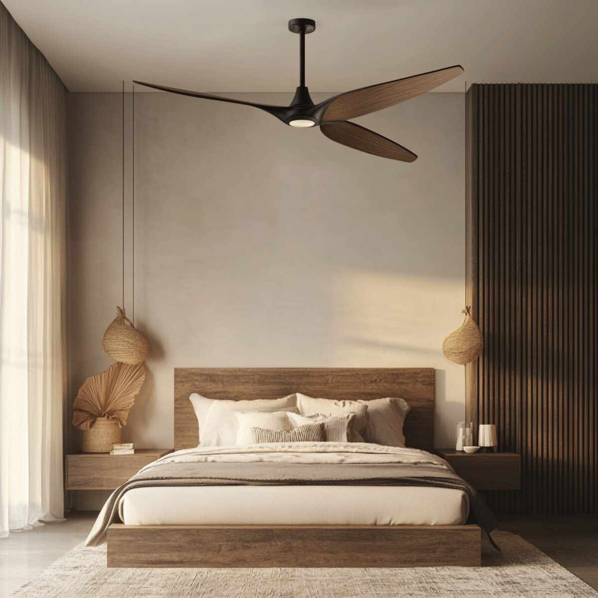 A fan with sleek wooden blades brings warmth and nature-inspired style into the bedroom.