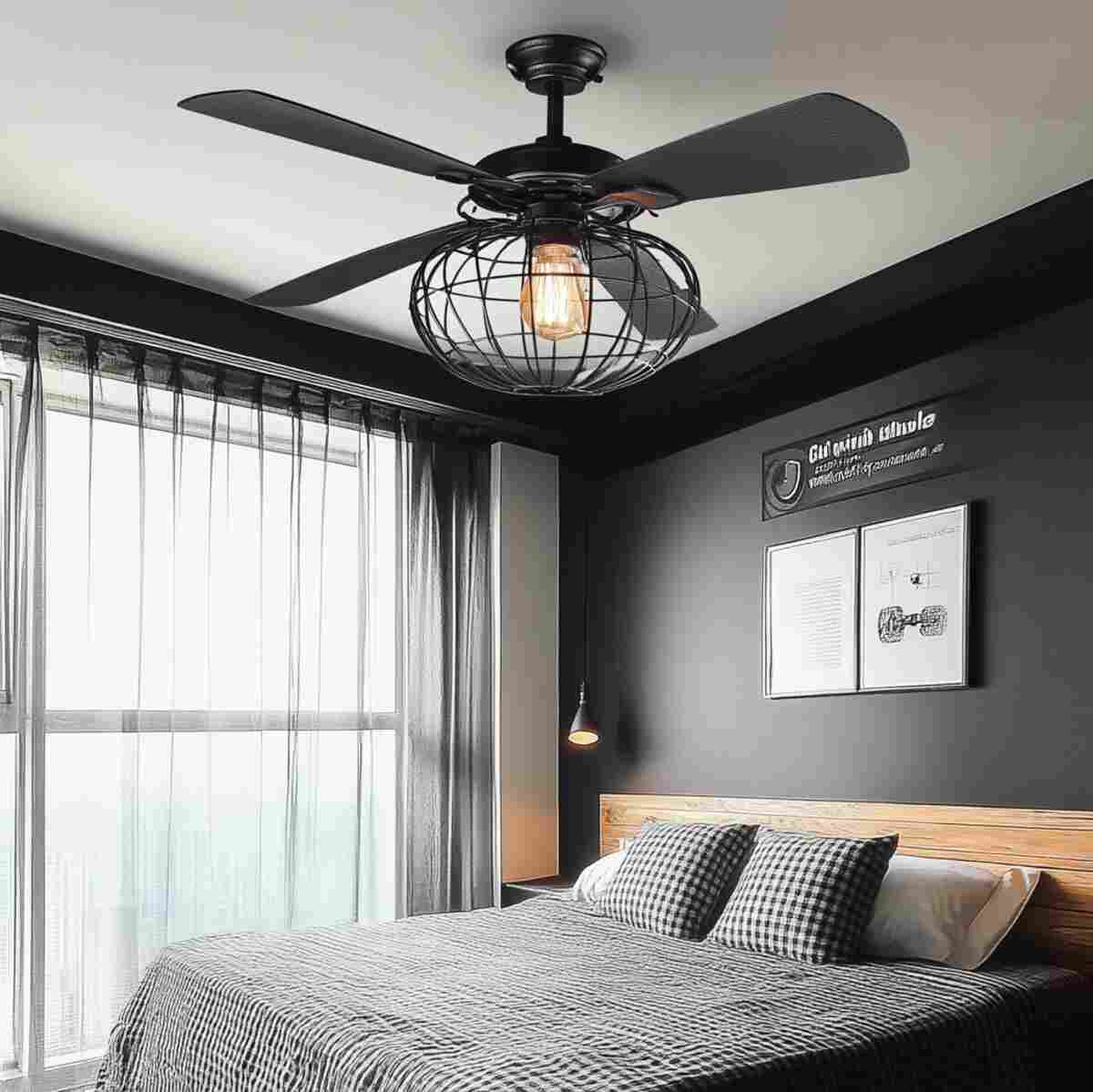 An industrial-style fan with a metal cage adds character and boldness to the bedroom. It’s a standout choice among Bedroom Ceiling Fan Design Ideas for people who enjoy a loft-inspired or urban theme.
