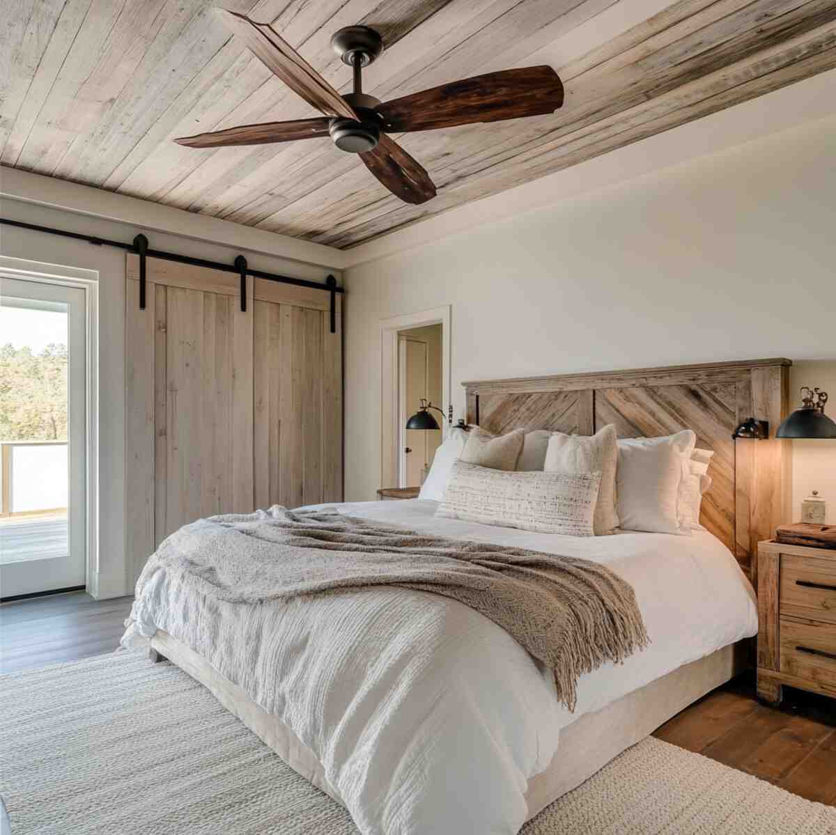 A farmhouse-style fan with reclaimed wood blades brings charm and vintage warmth to the room.