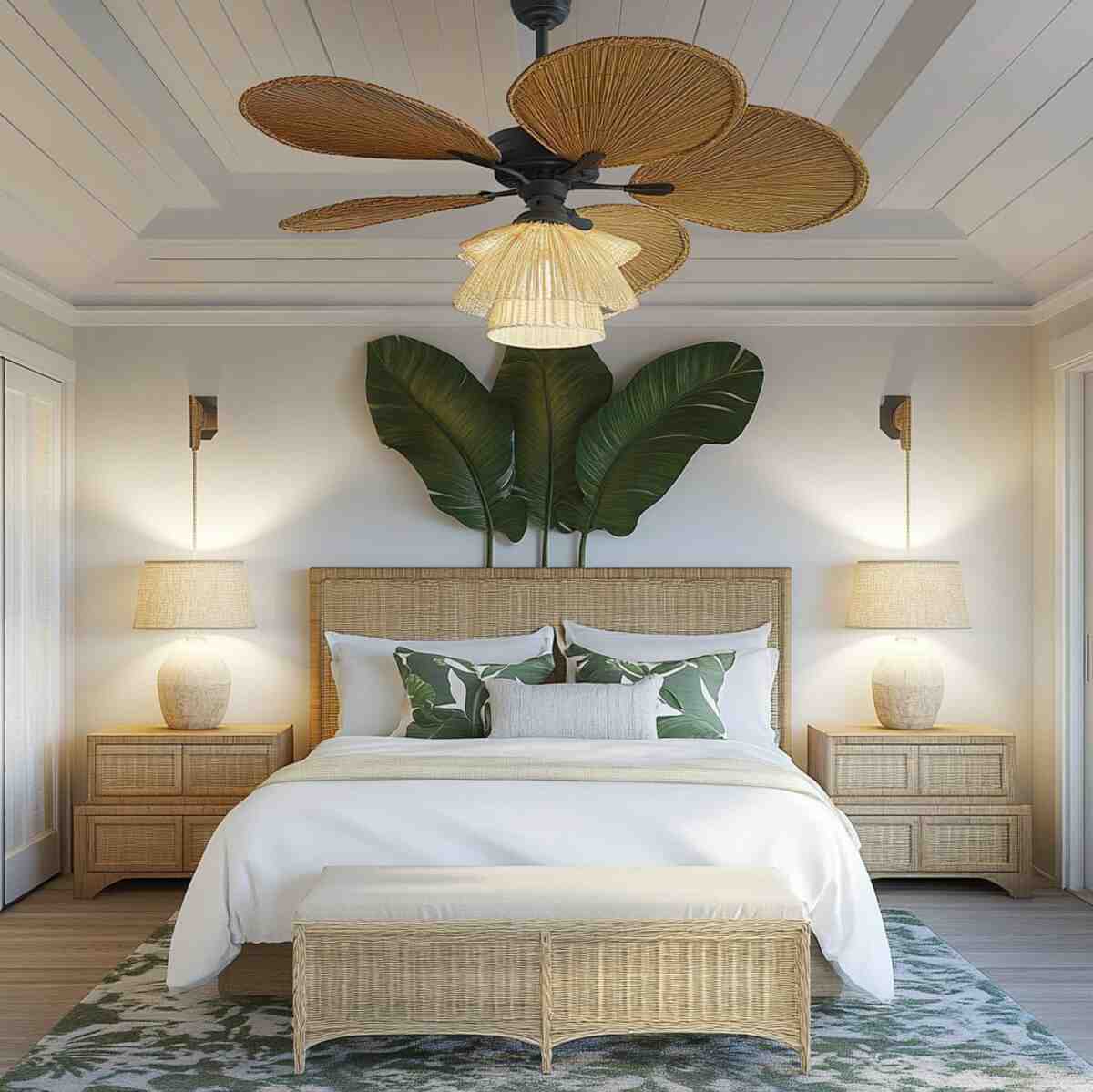 A tropical ceiling fan with palm-leaf blades instantly adds a sense of resort-style relaxation.
