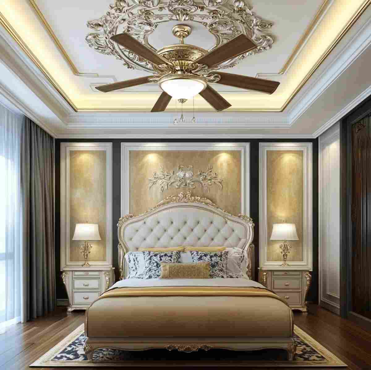 A gold and white fan brings a touch of luxury and brightness into the bedroom. It stands out in Bedroom Ceiling Fan Design Ideas for those who prefer glam or elegant interior styles.