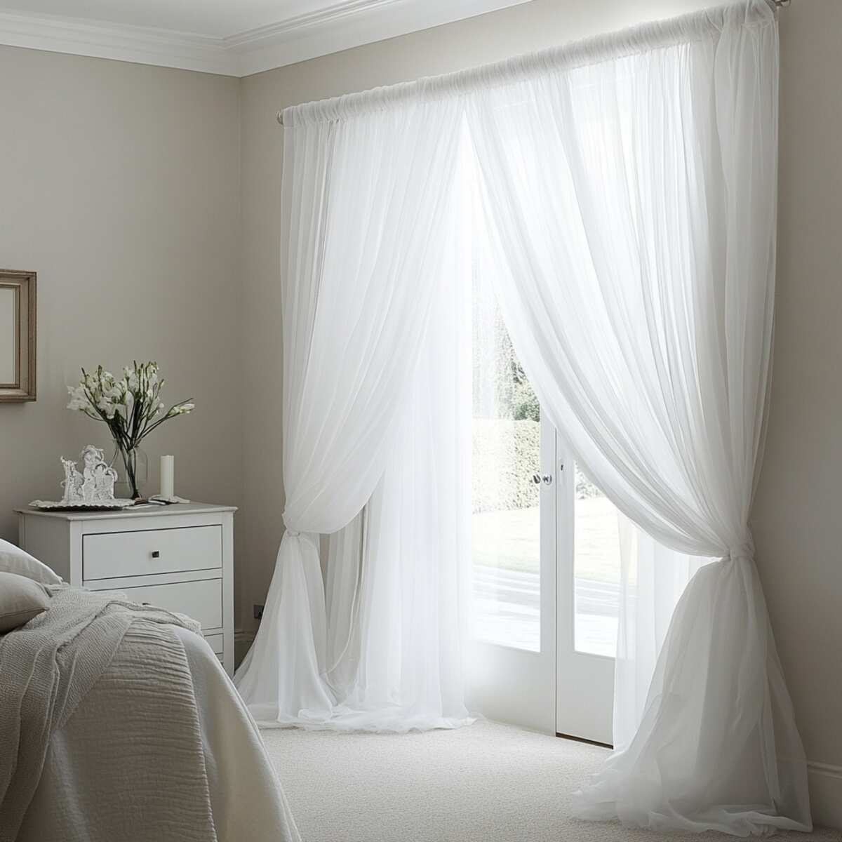Sheer white voile curtains bring a soft and airy look, making them one of the most refreshing Bedroom Door Curtain Ideas.