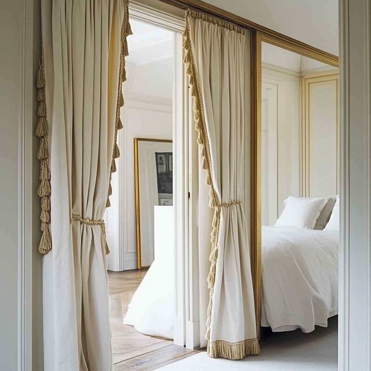 Curtains with tassel edges add a fun and decorative touch that enhances creative Bedroom Door Curtain Ideas.