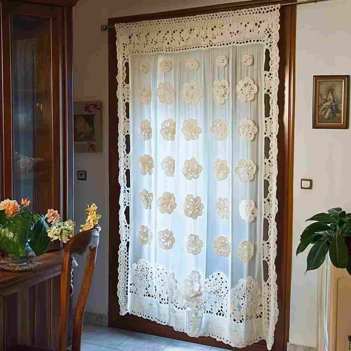 Crochet curtains bring a cozy handmade feel that fits beautifully within warm and charming Bedroom Door Curtain Ideas.