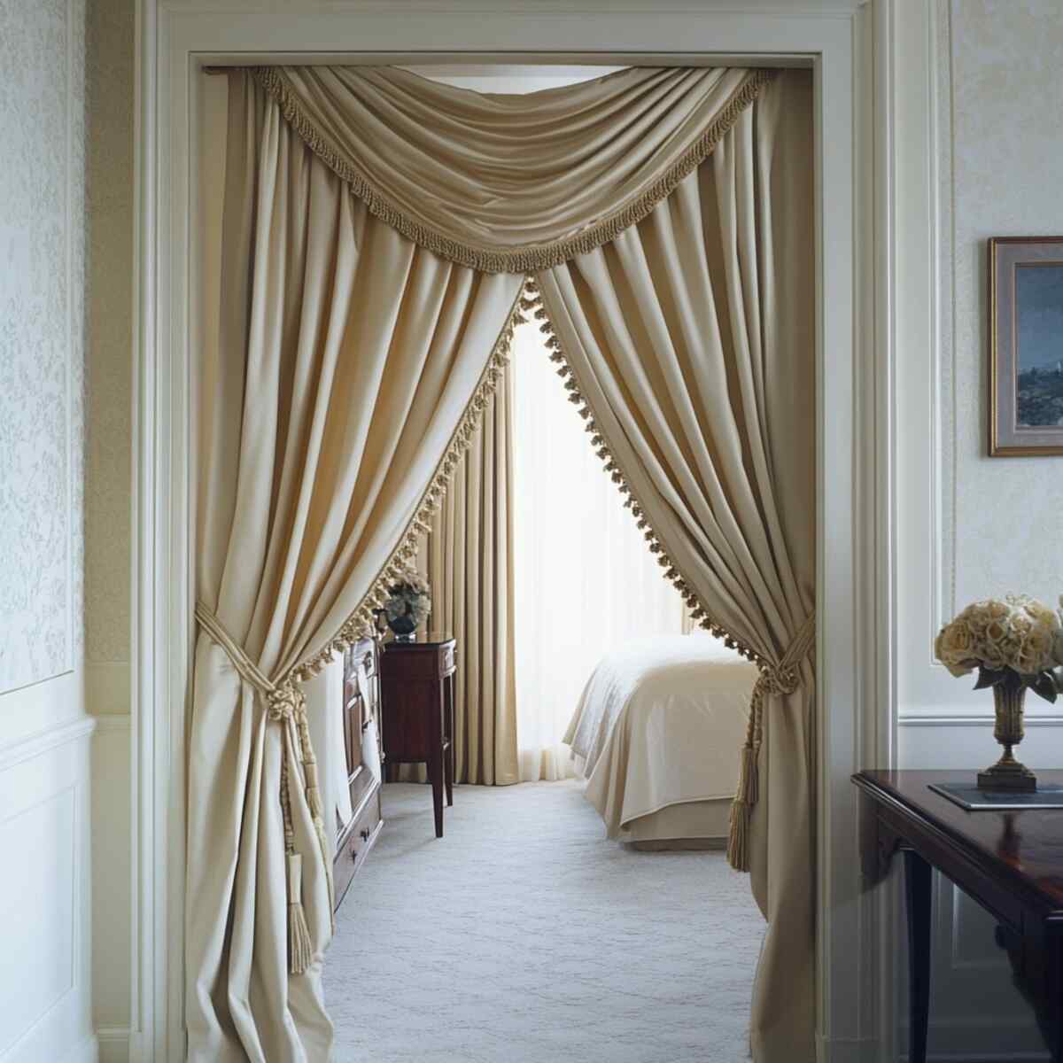 Their structured folds create a clean and elegant frame around your door. This style suits bedrooms that prefer traditional or hotel-inspired décor.