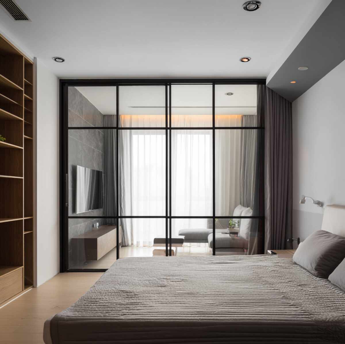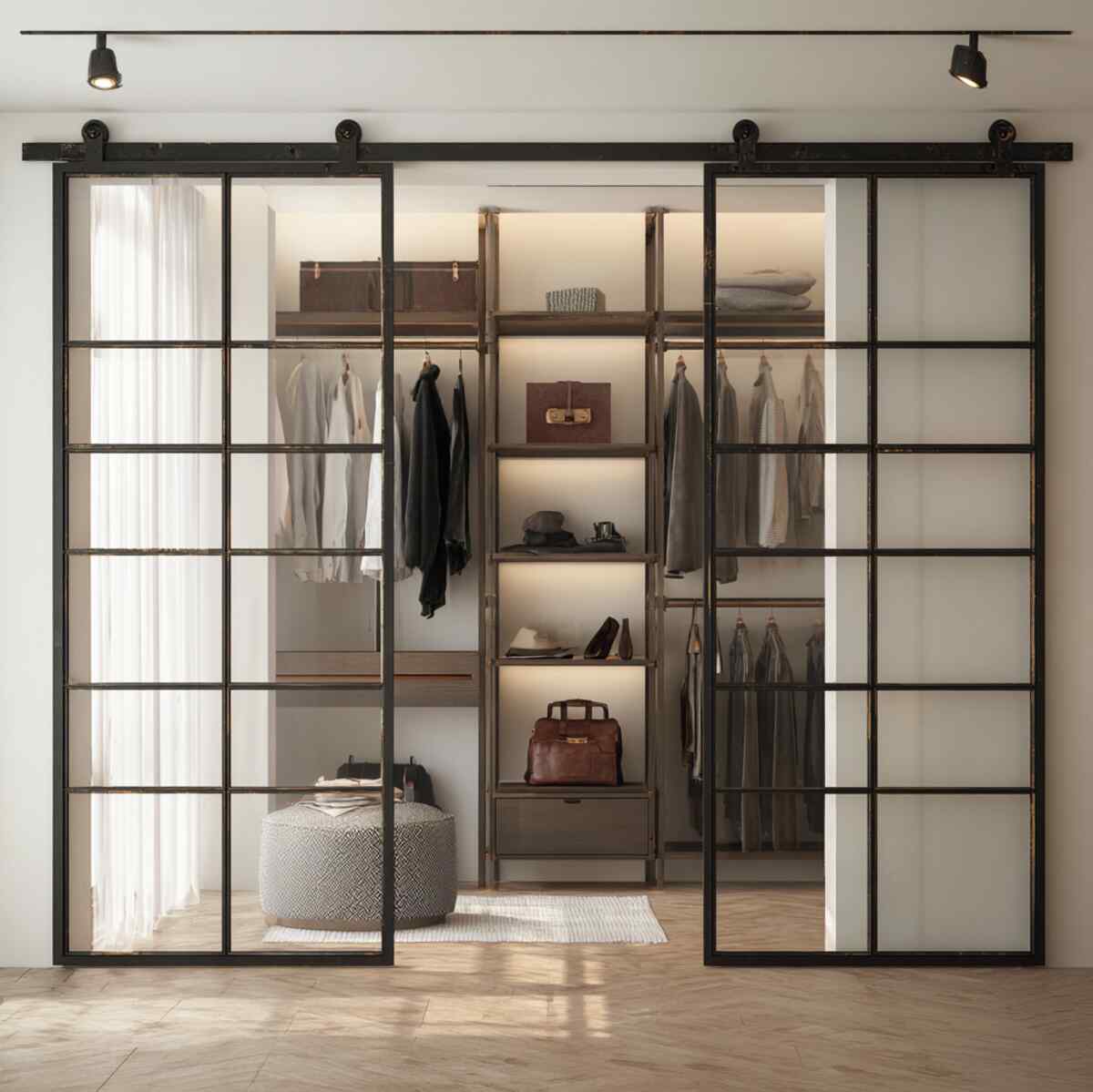 Sliding doors with slim metal frames give your bedroom a modern, minimal, and industrial feel.