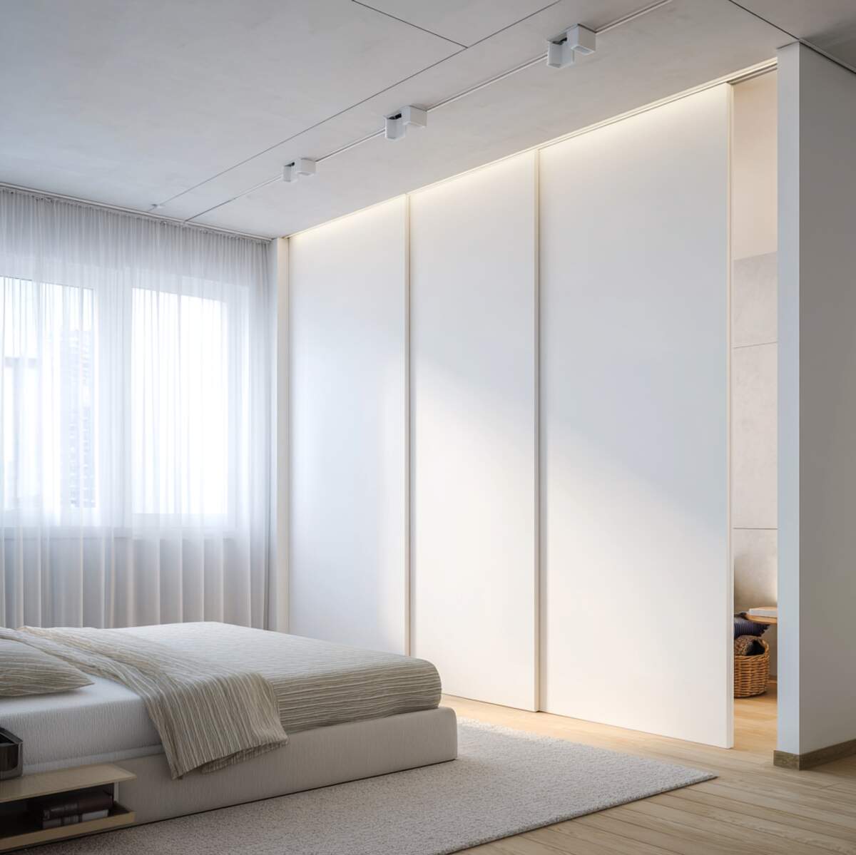 White minimalist sliding doors create a clean, calming atmosphere in the bedroom.