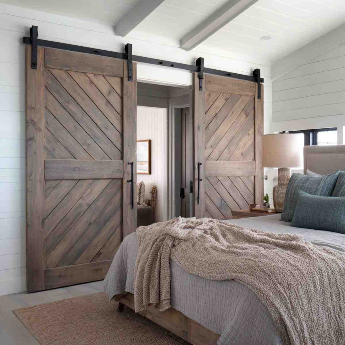 Barn-style sliding doors bring rustic charm into the bedroom while saving space. This Bedroom Sliding Door Closet Idea works well in farmhouse or industrial-inspired interiors.