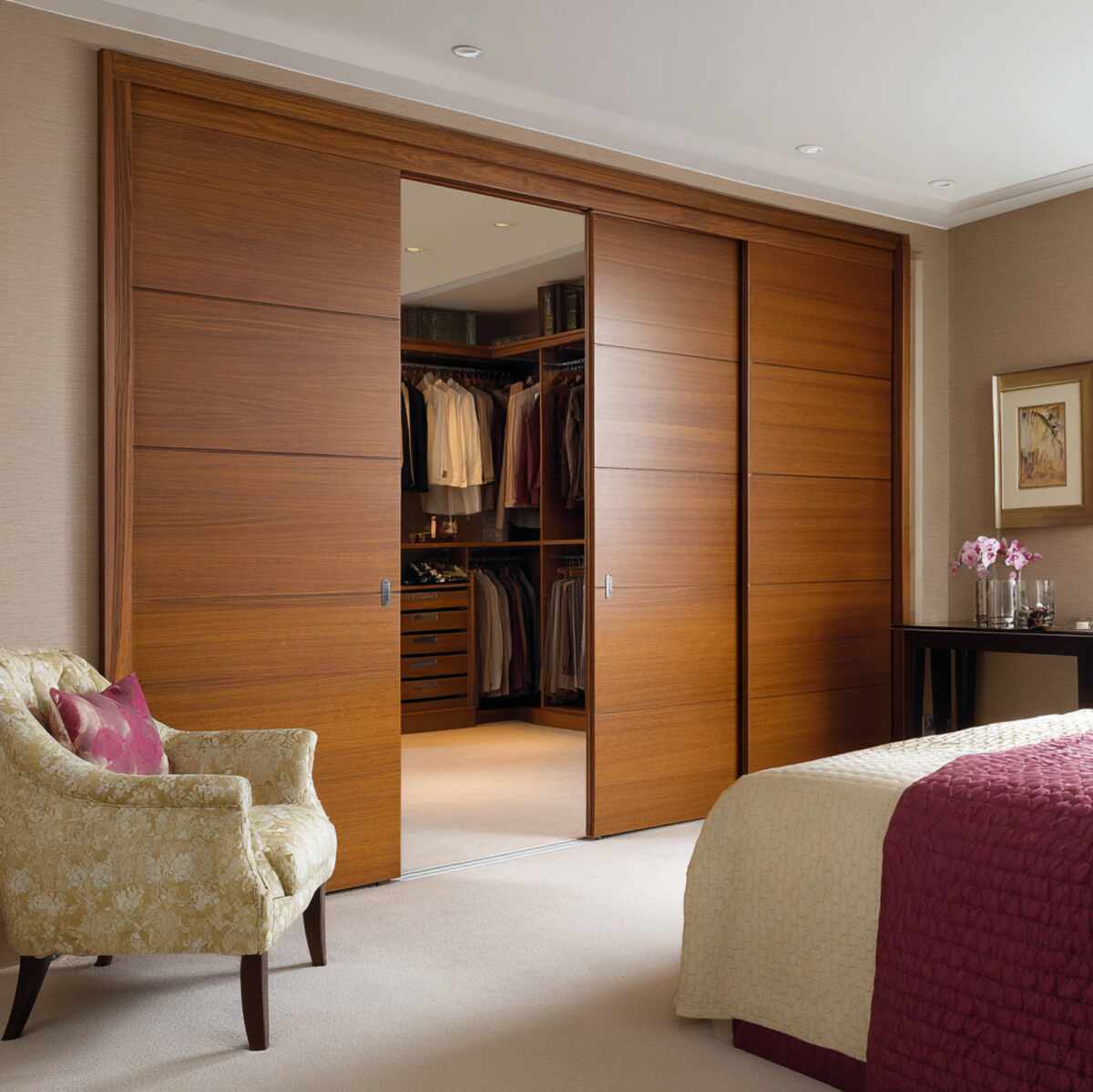 Wooden panel sliding doors offer warmth and a natural look to the bedroom.