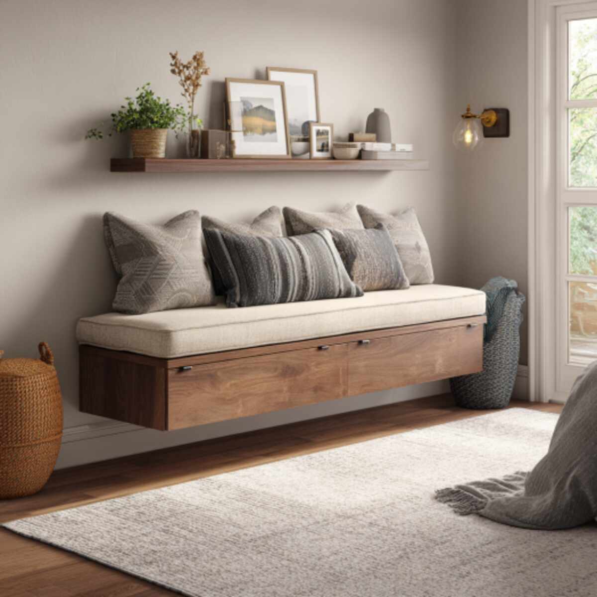 Floating Storage Bench Attached to the Wall