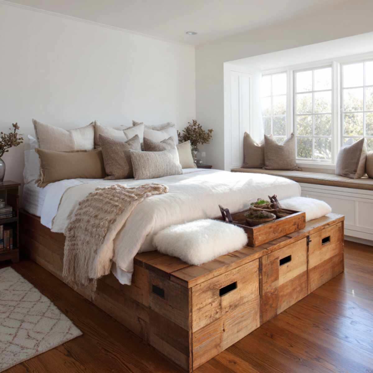 Rustic farmhouse benches are cozy Bedroom Storage Bench Ideas that emphasize comfort and character.